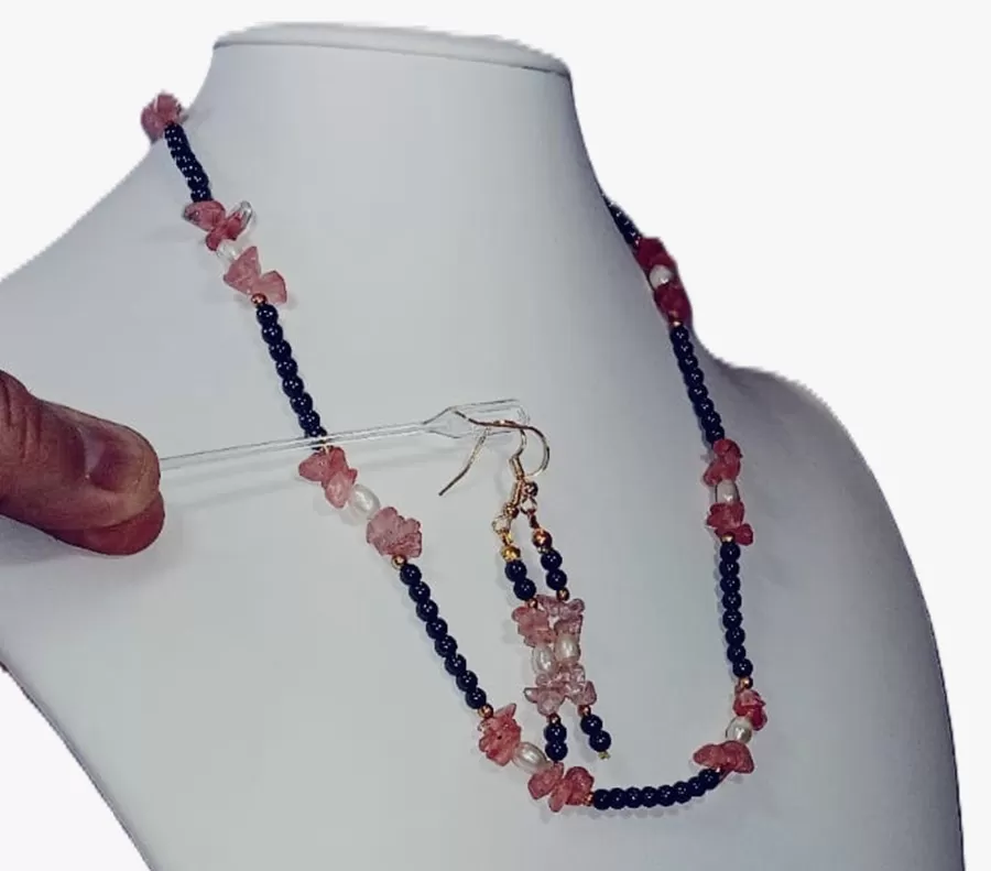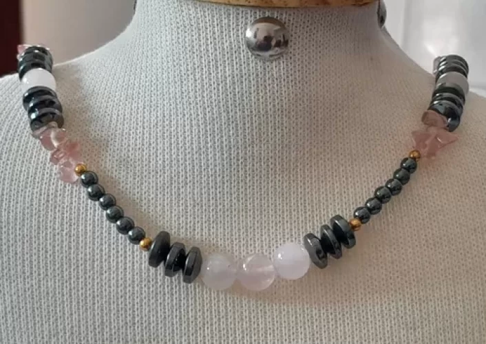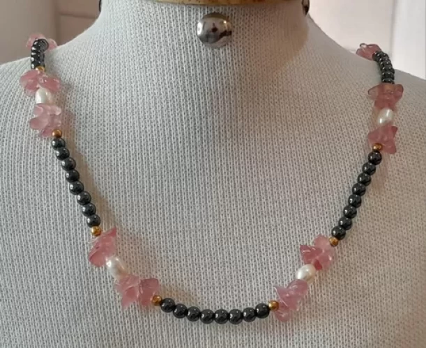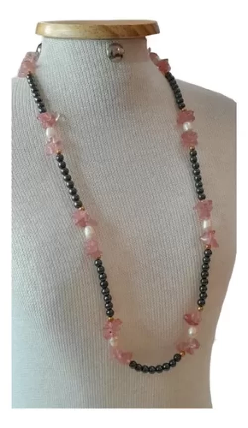 Colar Quartzo Rosa Pérola Hematita Artesanal Exclusivo C768