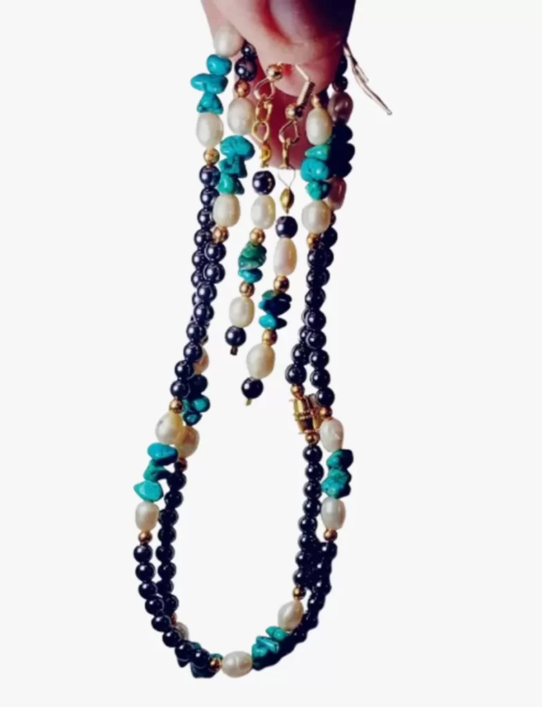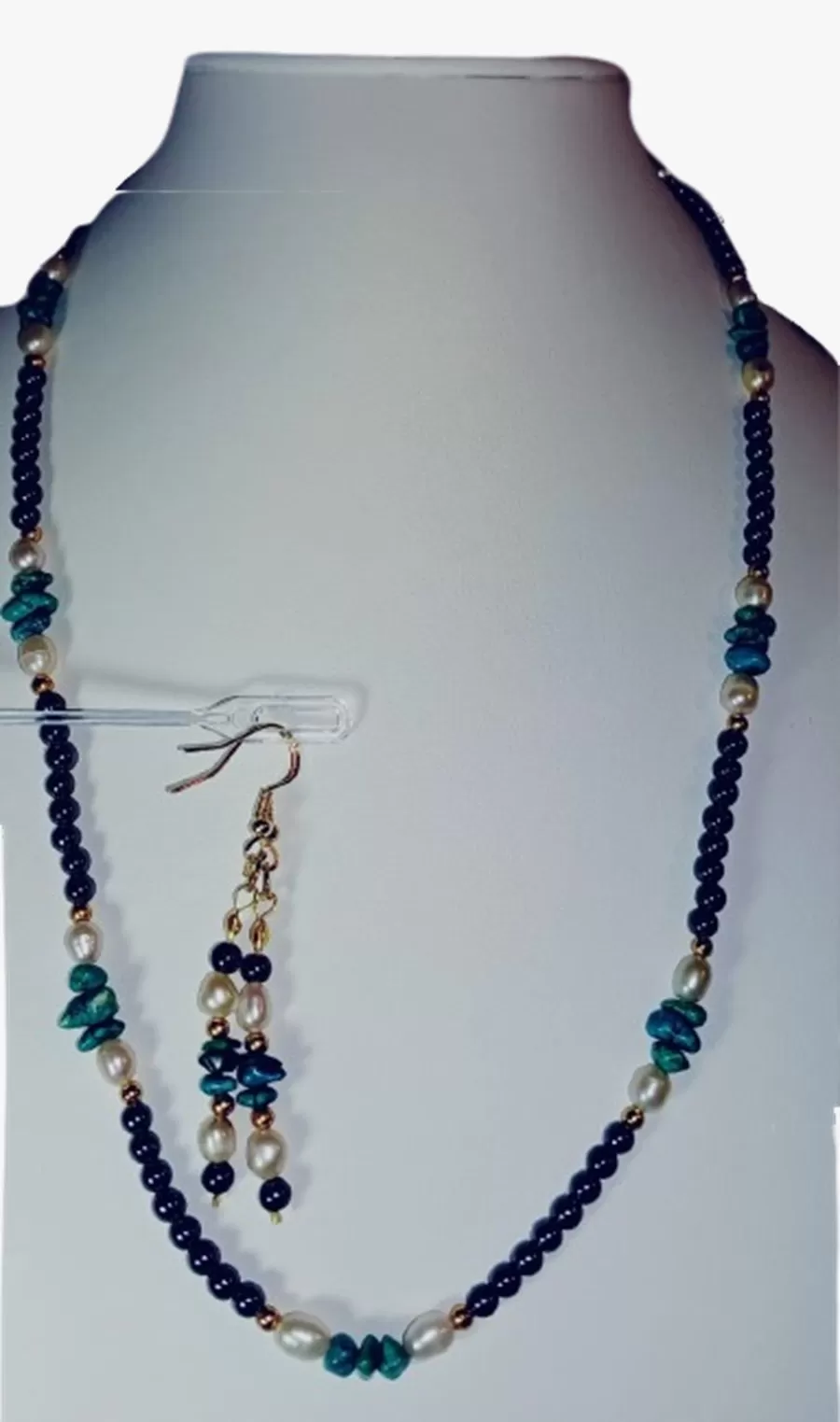 Colar Turquesa Verdadeira e Pérolas Naturais + Brinco CB767