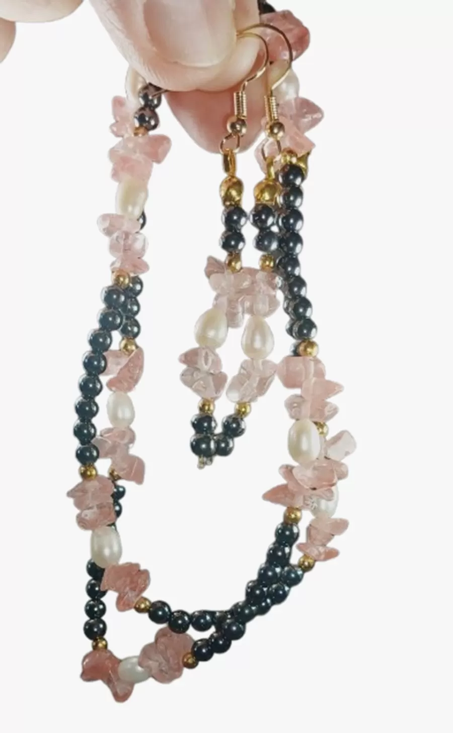 Colar Quartzo Rosa Pérolas e Hematita + Brinco Grátis CB768