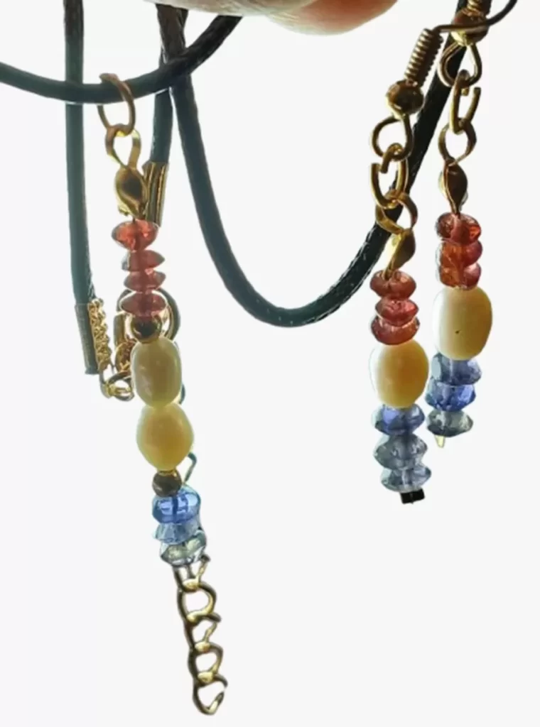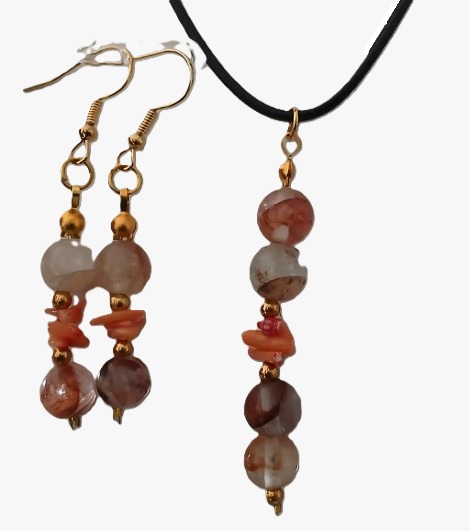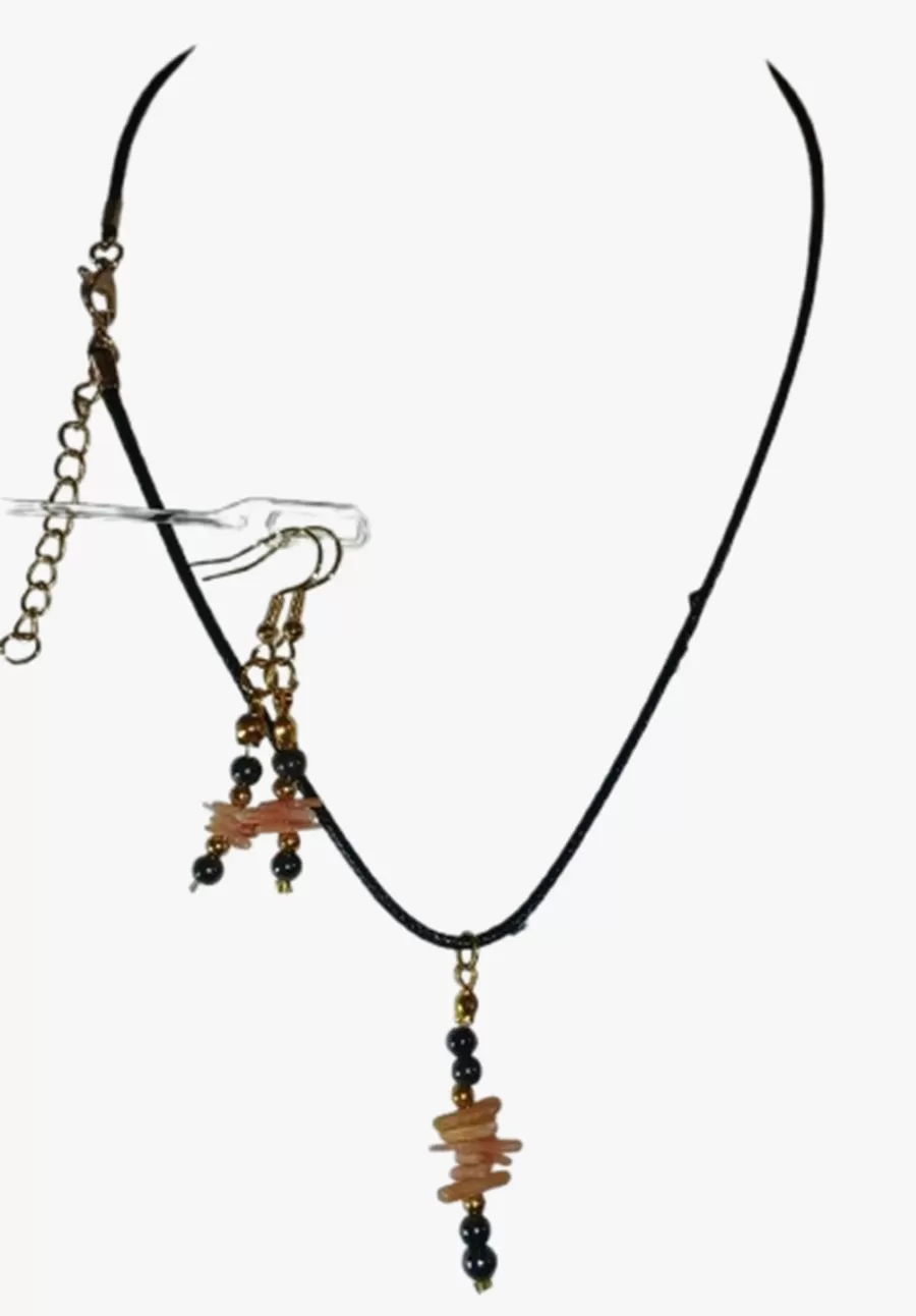 Colar Cordão Pedras Coral Hematita Brinco e Pingente Cr616