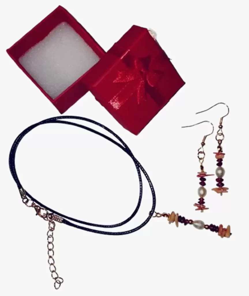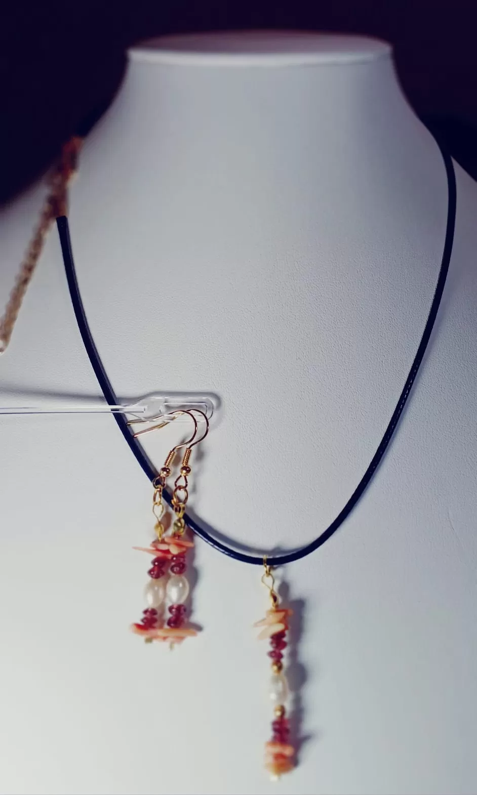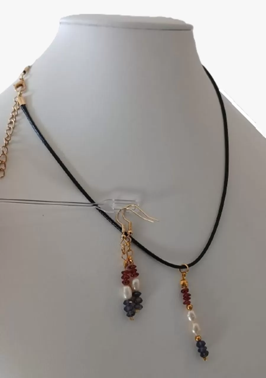 Colar Cordão Pedras Pérolas Granadas e Coral + Brinco Cr619