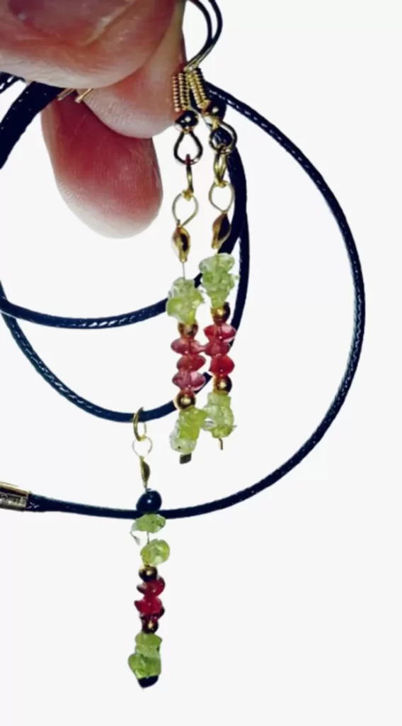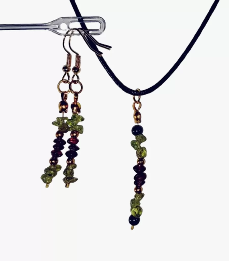 Colar Cordão Pedras Olivina e Granada + Brinco Cr622
