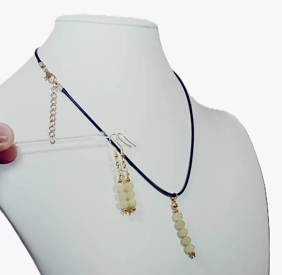 Colar Cordão Pedras Jadeíta Lapidada Pingente e Brinco Cr842