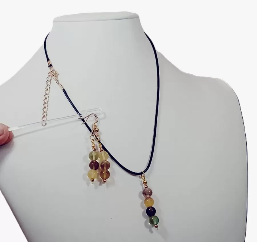 Colar Cordão Pedras Fluoritas Lapidadas 8mm + Brinco Cr846