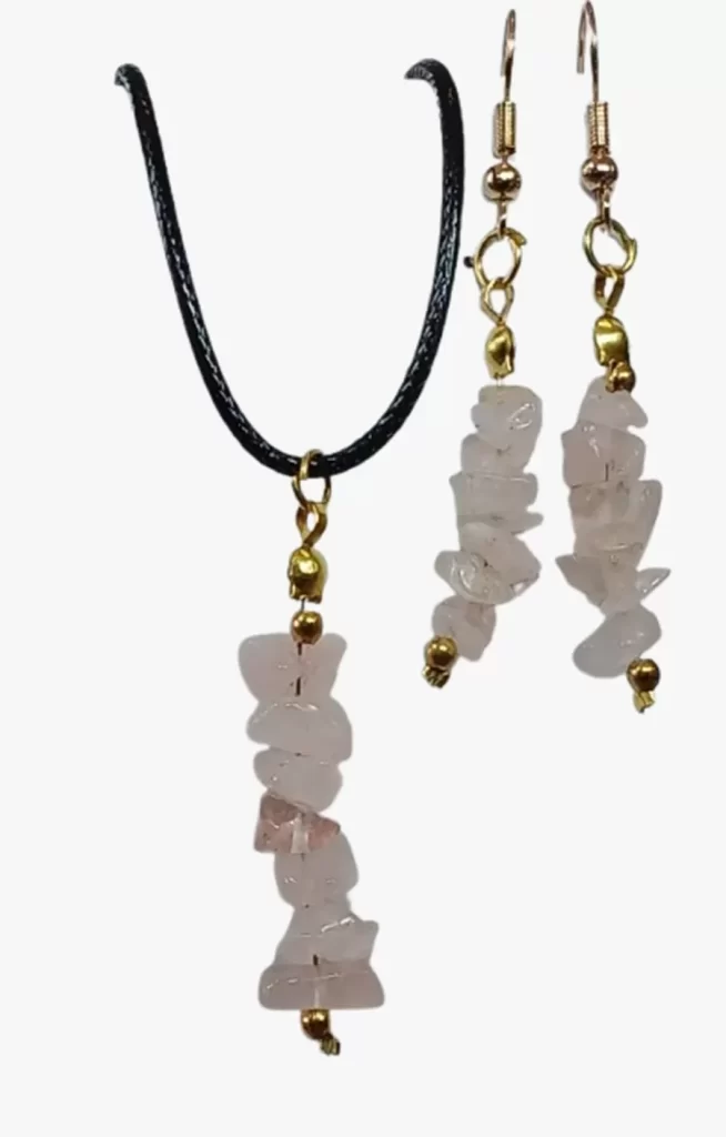 Colar Cordão Pedras Quartzo Rosa e Ametista + Brinco Cr859