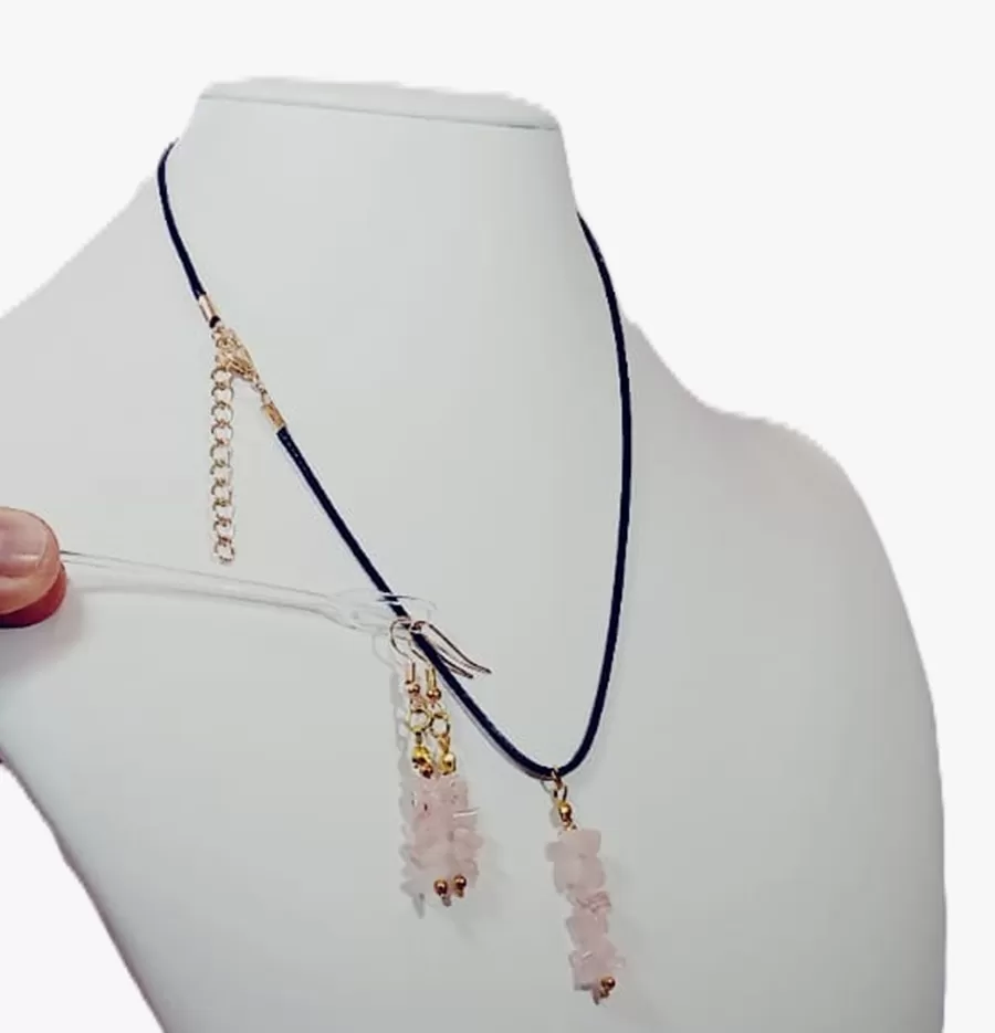 Colar Cordão Pedras Quartzo Rosa e Hematitas + Brinco Cr795
