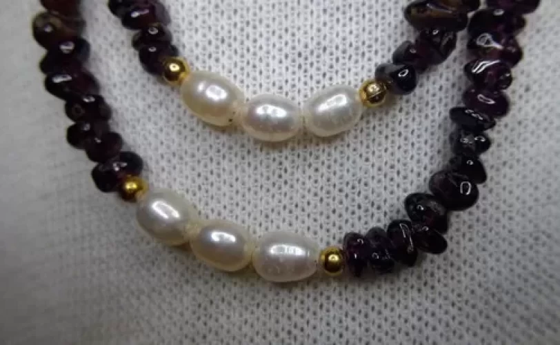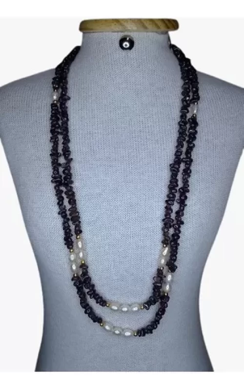 Colar Granadas Vinho E Pérolas D’agua 2 Fios 50+59cm 3541c