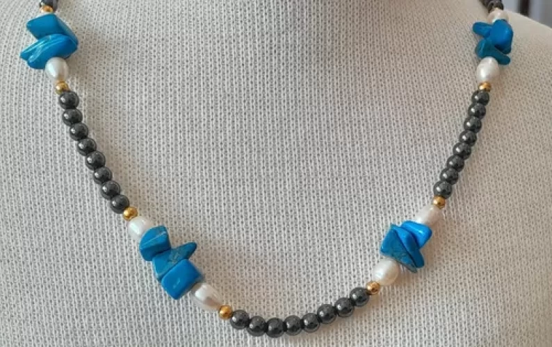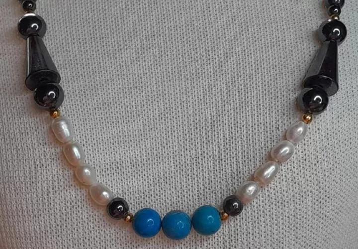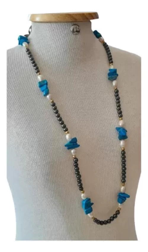 Colar Howlita Turquesa Pérola Hematita Artesanal Exclus C758