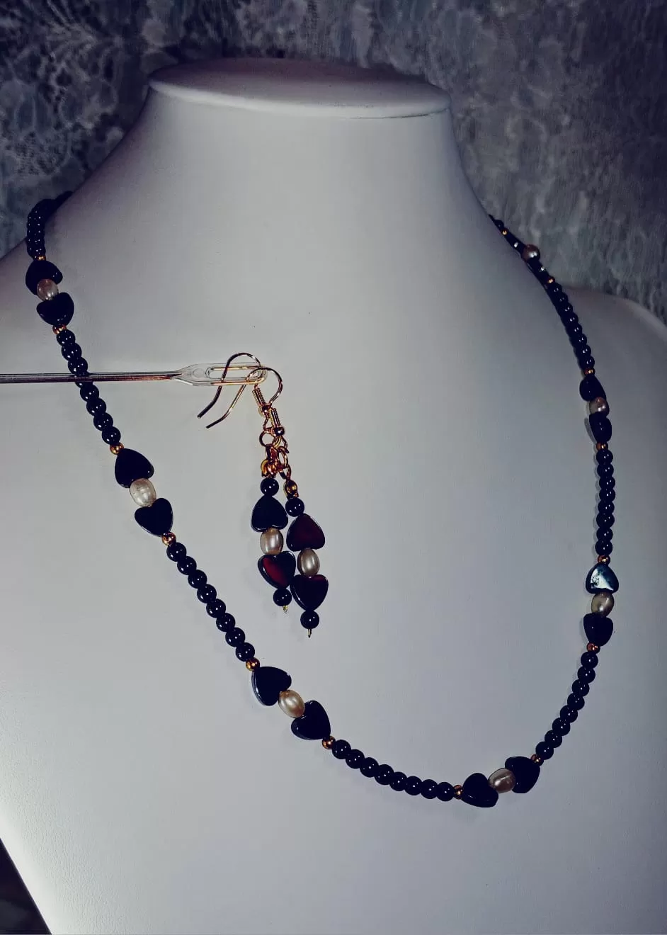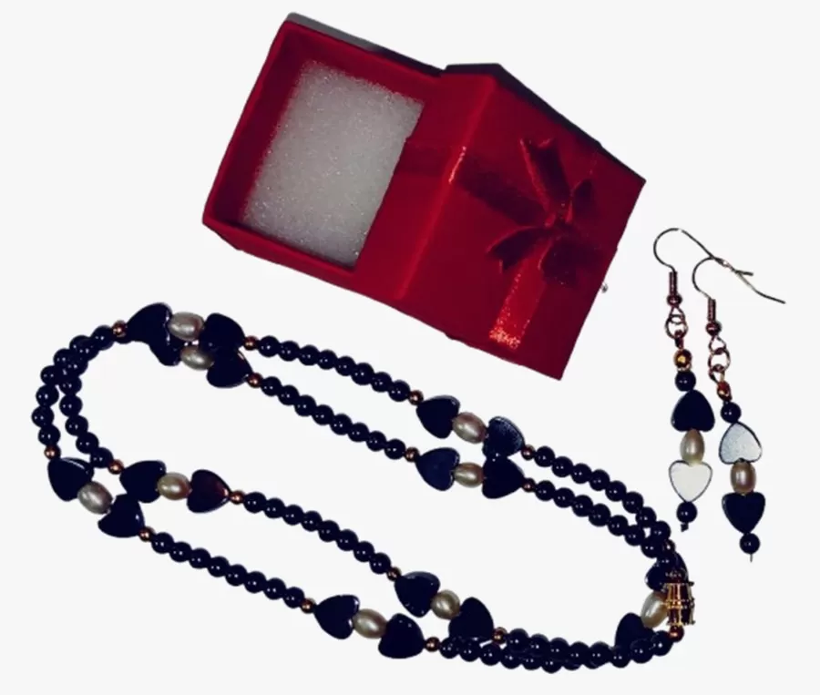 Colar Hematitas Lapidadas e Pérolas Naturais + Brinco CB778