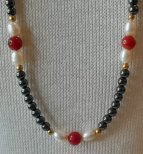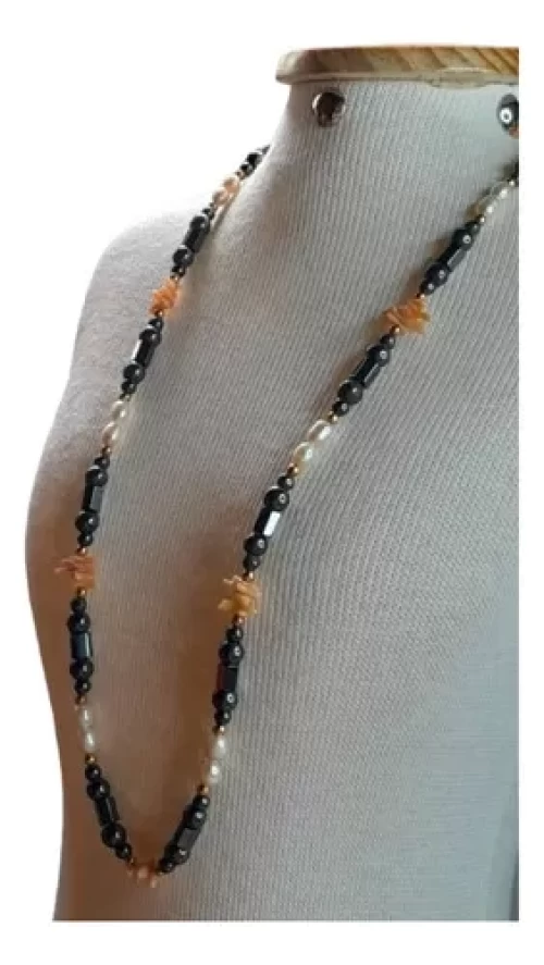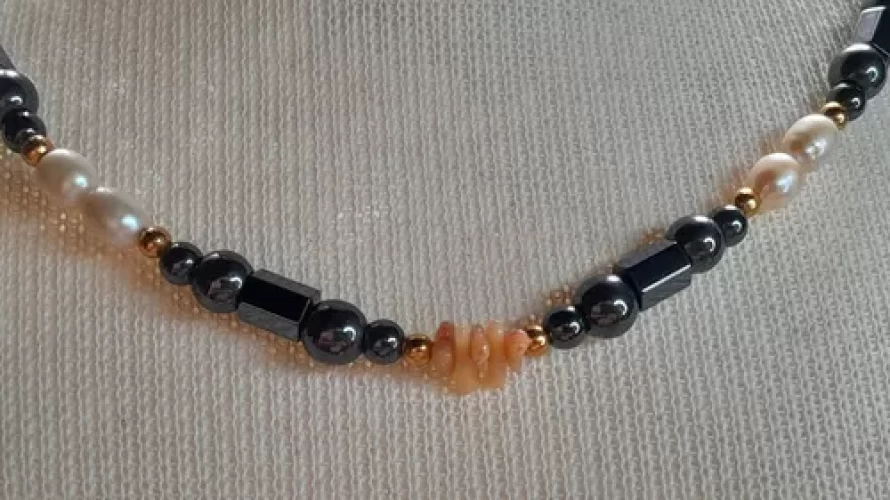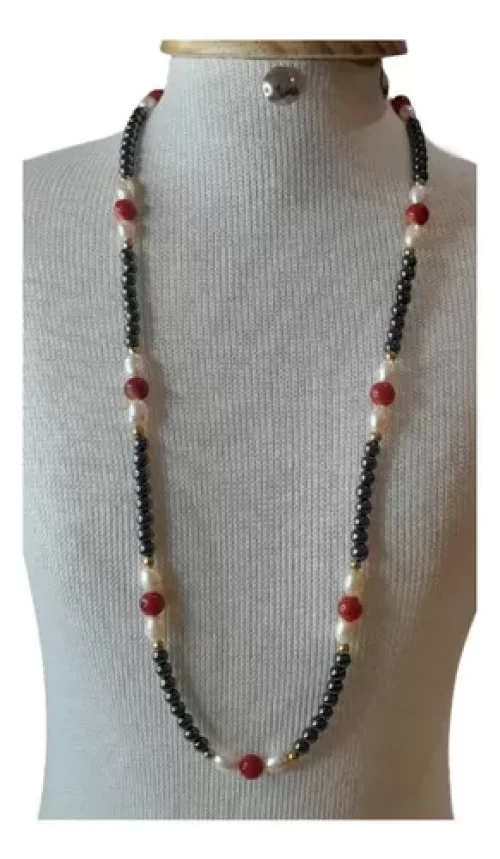 Colar Coral Pérolas Hematitas Peça Artesanal Exclusivo C764