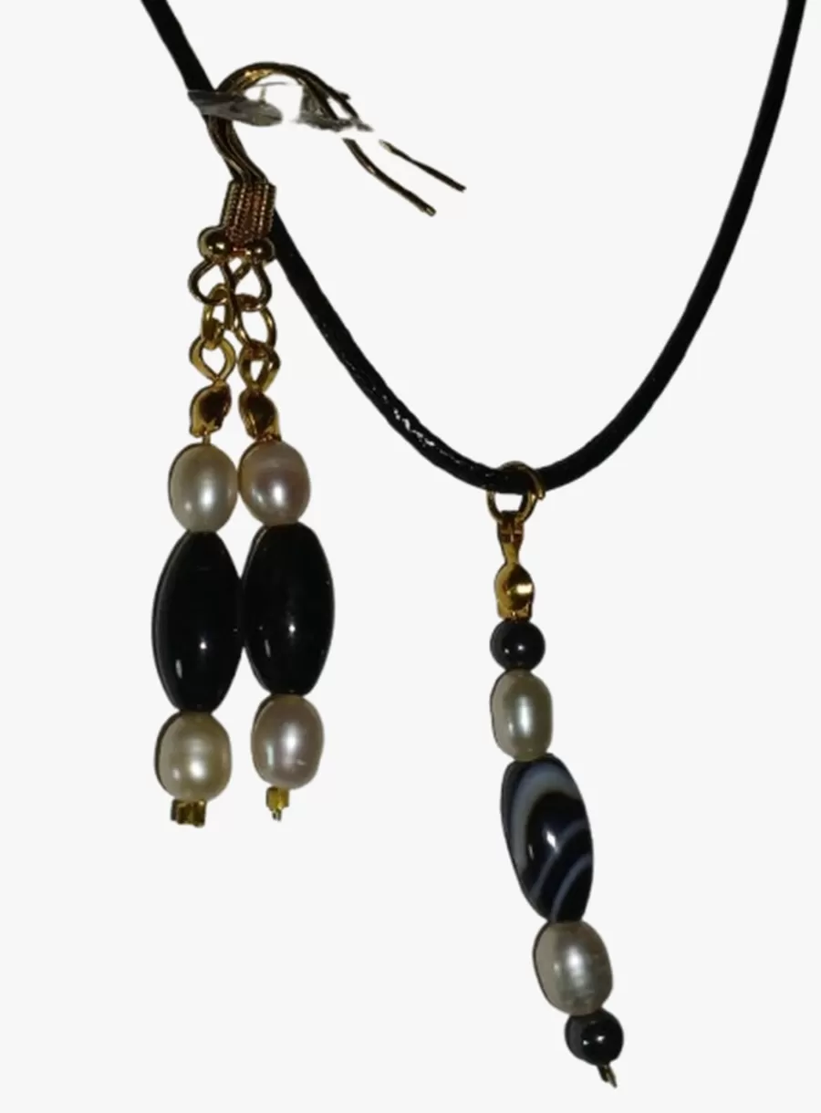 Colar Cordão Ágata Preta e Pérola Natural + Brinco Cr790