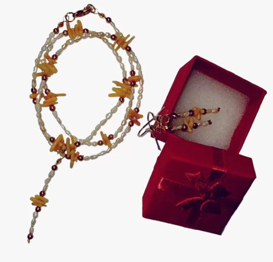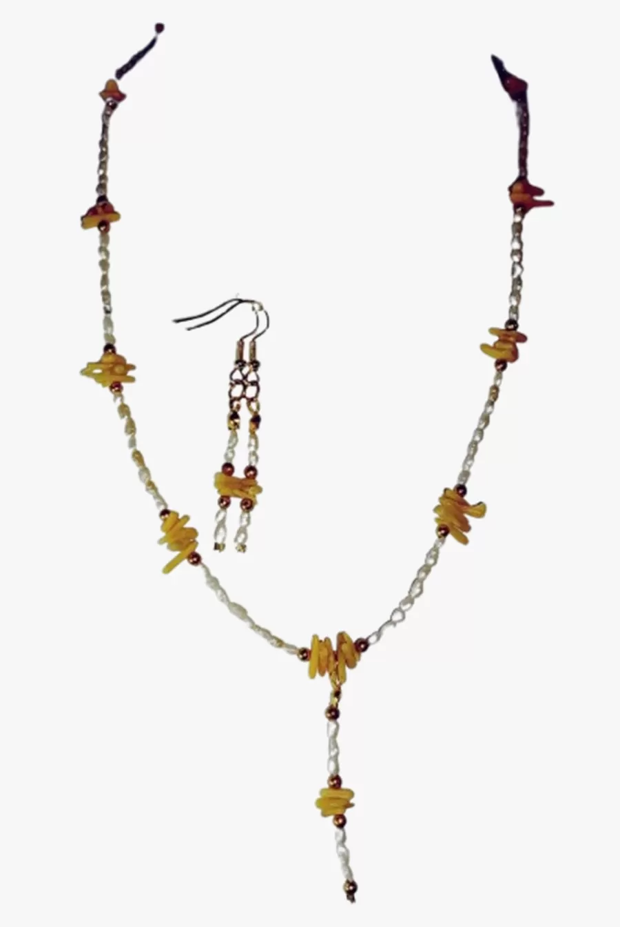 Colar Coral Filipinas Amarelo Pérolas + Brinco Grátis CBP359