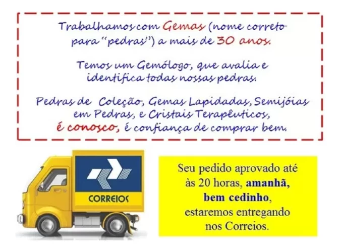 ATENÇÃO: As pedras podem ter variações de cor, tamanho, formas e pesos em relação às fotos por serem pedras naturais. É comum os minerais conterem ranhuras, fissuras, veios alterados, e inclusão de outros minerais, não só pela extração, como também na manipulação de limpeza. O produto que você receberá é similar ao das fotos, com formas diferentes, e medidas aproximadas, sempre, porém, mantendo o mínimo do tamanho (ou peso, se for o caso) do anunciado/fotografado. FOTOS REALIZADAS EM MINI ESTÚDIO FOTOGRÁFICO COM VÁRIOS FOCOS DE LUZ PARA AVILTAR AS CORES DAS PEDRAS.