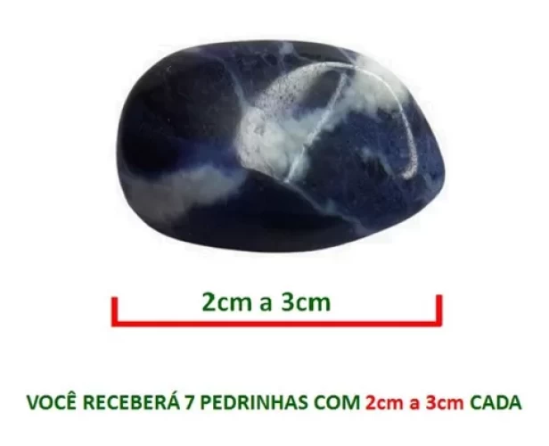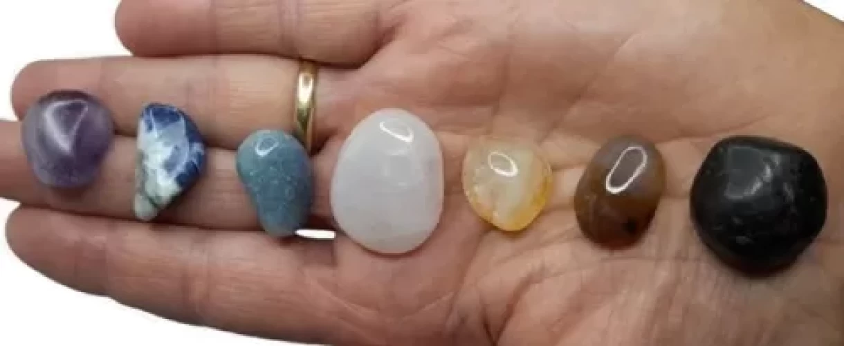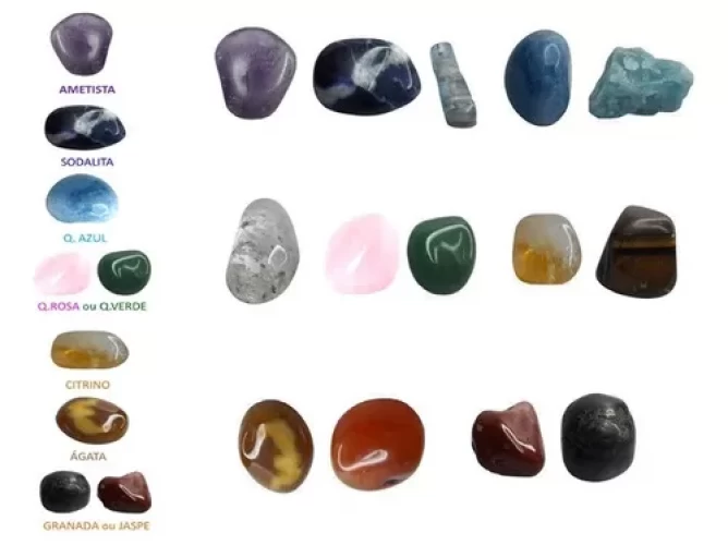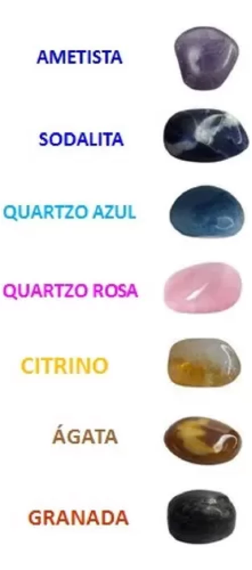 1 Ametista, 1 Sodalita, 1 Quartzo Azul, 1 Quartzo Rosa ou Verde, 1 Citrino, 1 Ágata ou Cornalina, 1 Granada ou Jaspe, com TAMANHOS entre 2cm à 4cm por unidade/PEDRA.