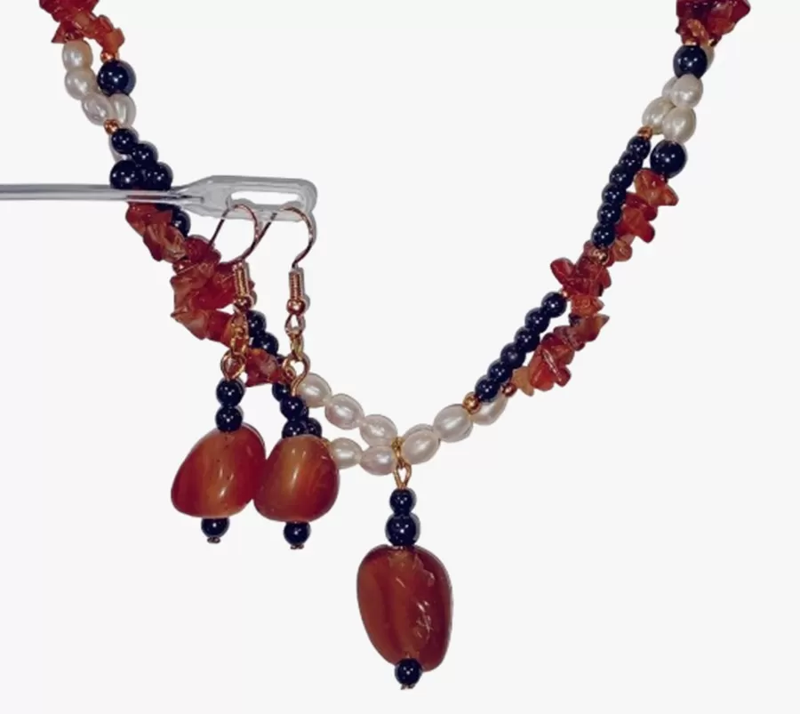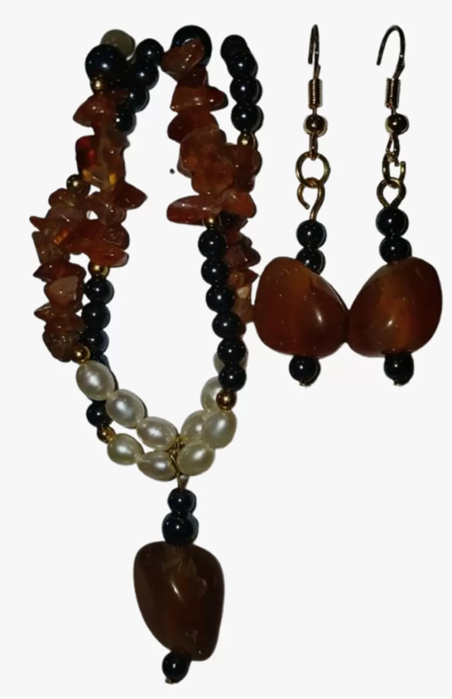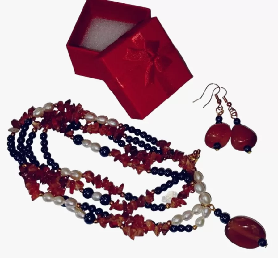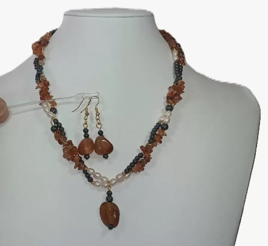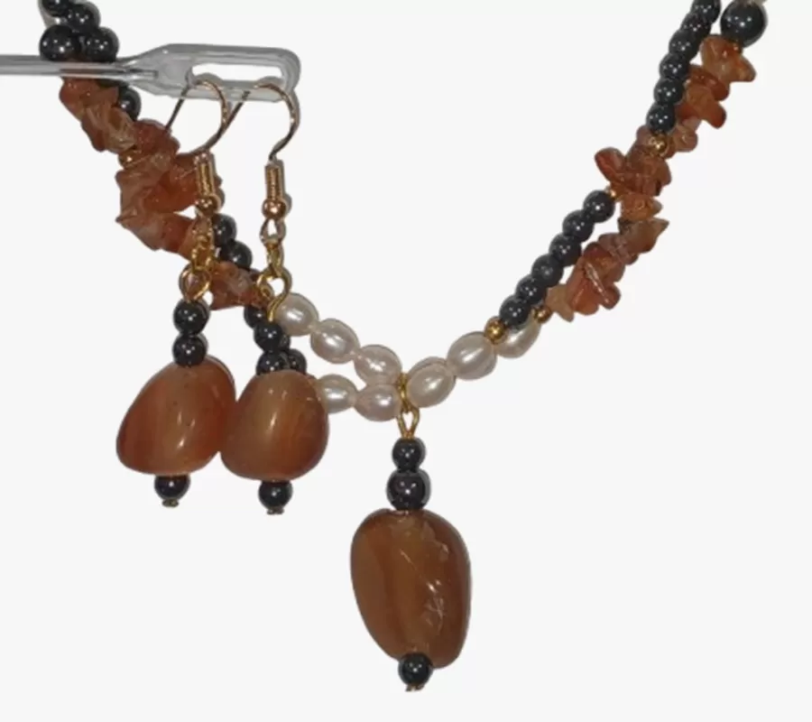 Colar Ágatas Pérolas Naturais e Hematitas Pingente e Brinco