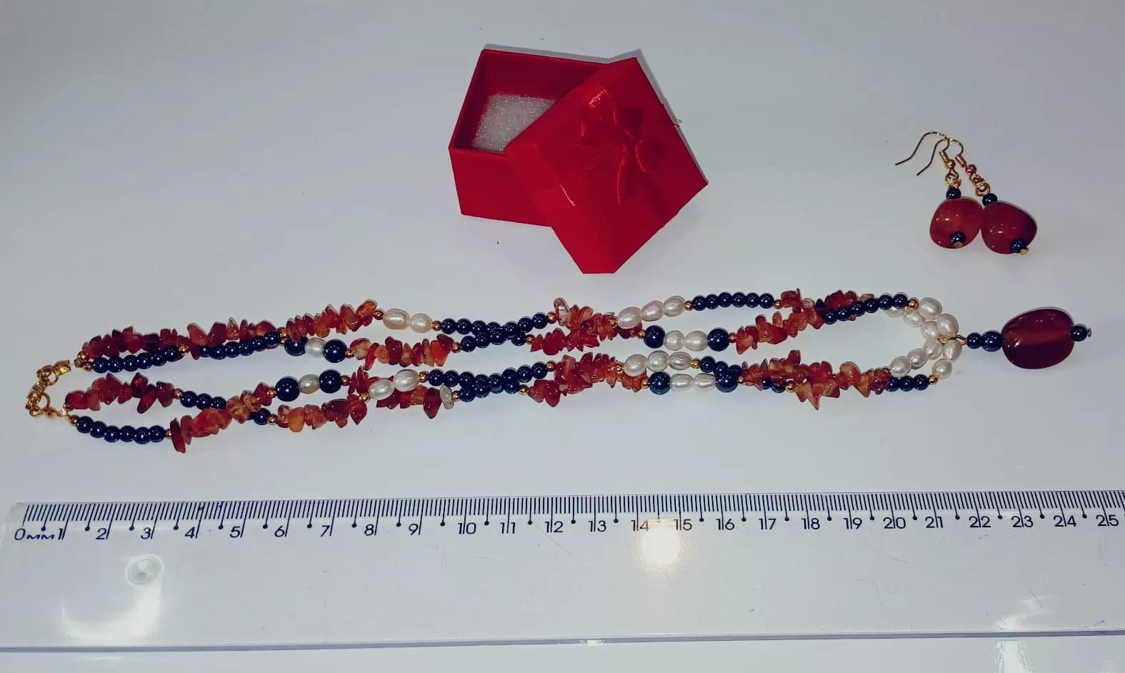 Colar aberto 92cm – Brinco 3cm – Fechado 23cm + Pingente 3cm