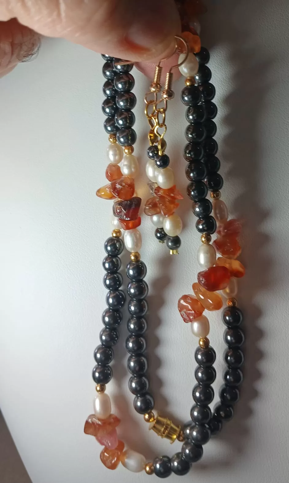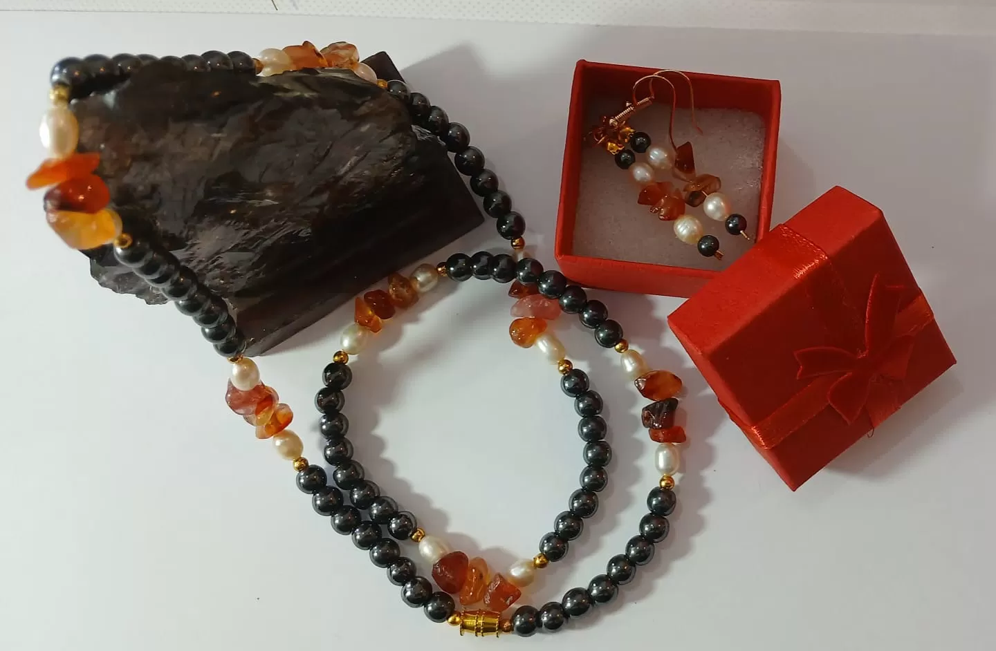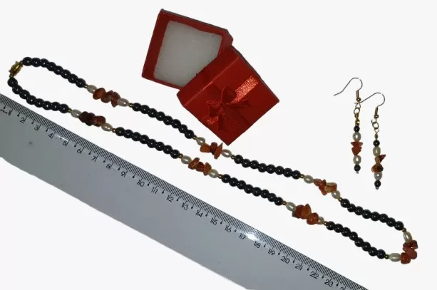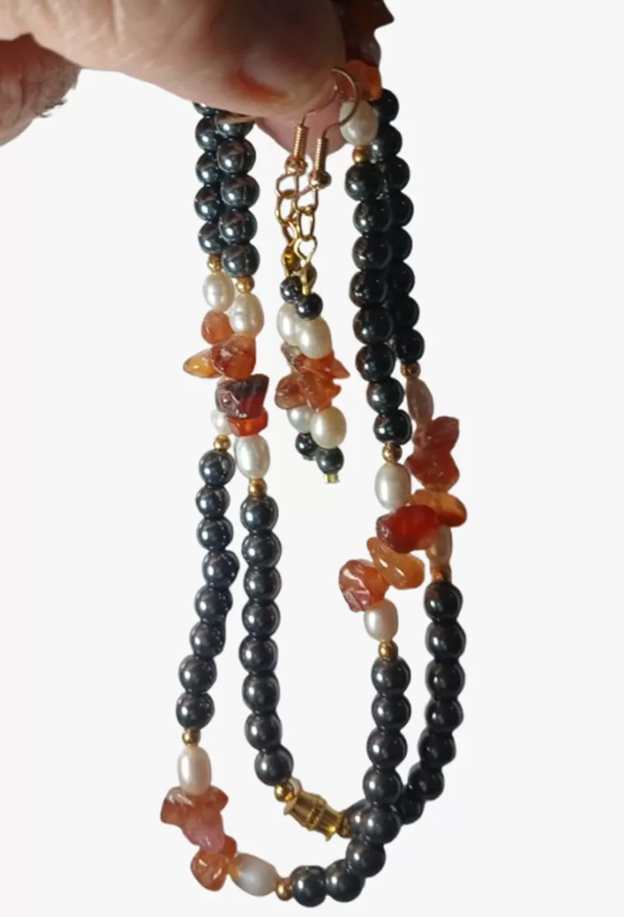 Colar em Pedras Naturais Ágata Fogo, Pérolas de Água Doce e Hematitas Lapidadas 5mme Bricos GRÁTIS
