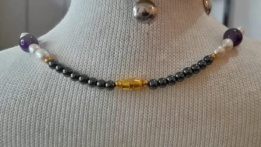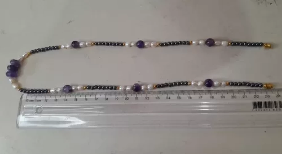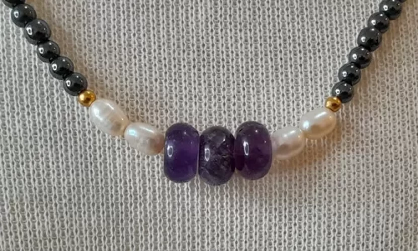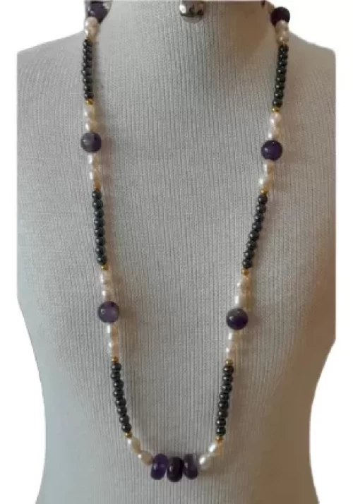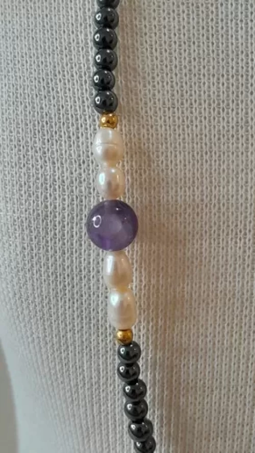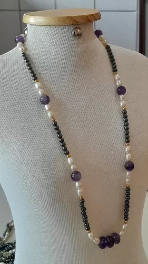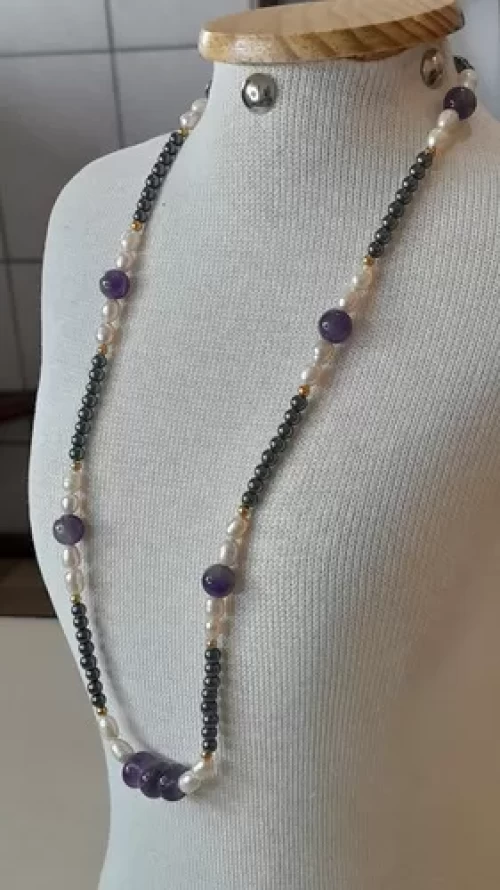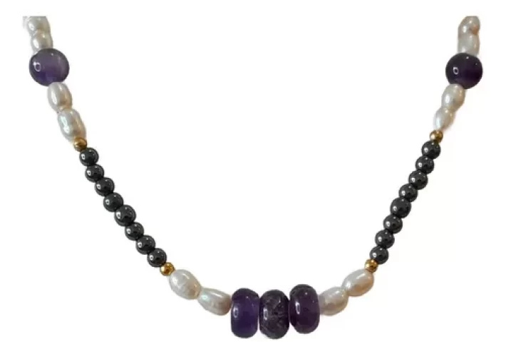 Colar de Ametistas Lapidadas, Pérolas Naturais e Hematitas 3mm.