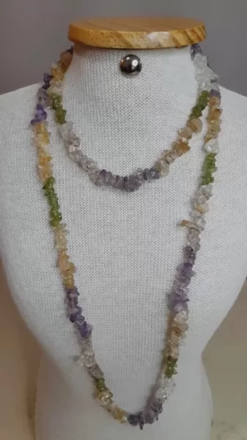 Pedras: Quartzo, Citrino (amarelo claro), Ametista (roxa) e Olivina (verde claro).