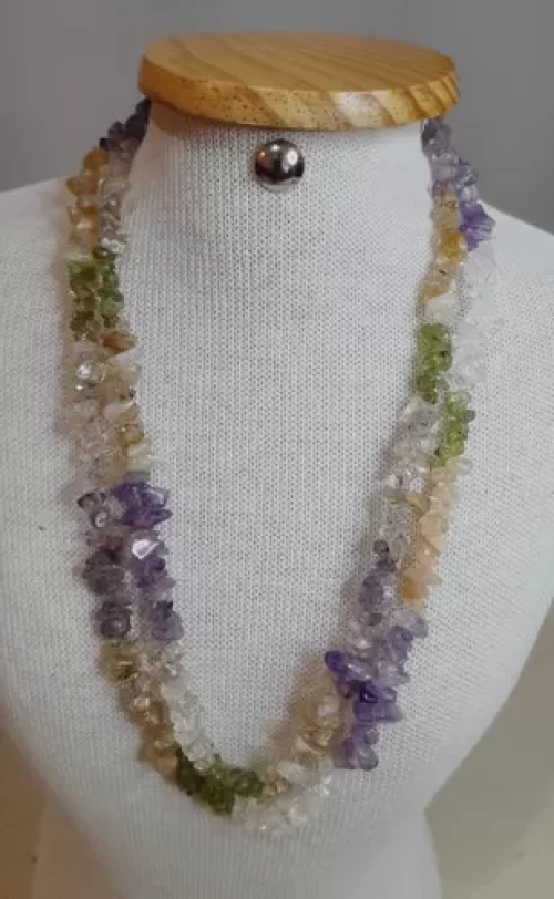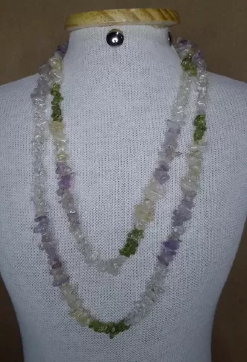 Pedras: Quartzo (branco transparente), Citrino (amarelo), Ametista (roxa) e Olivina (verde claro).