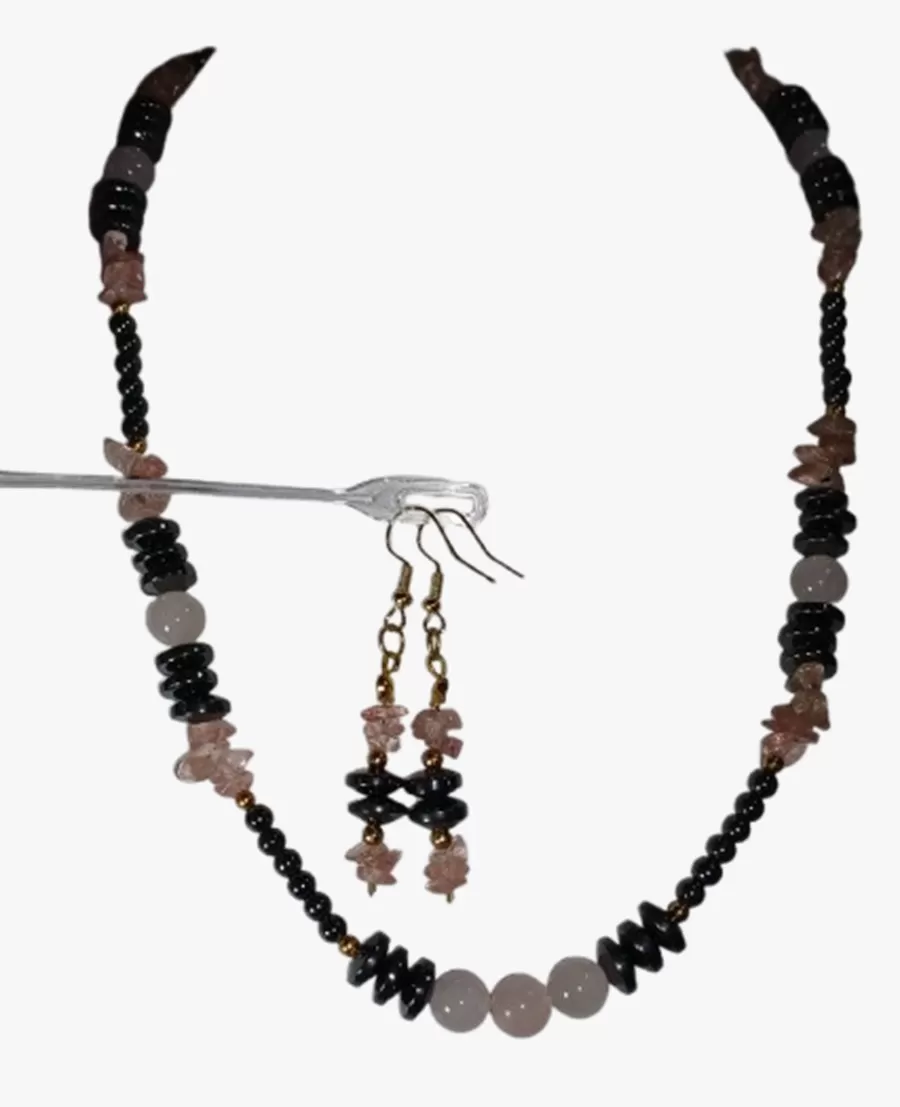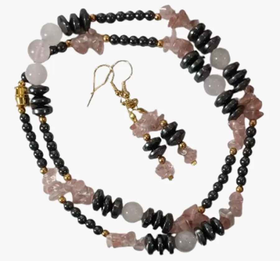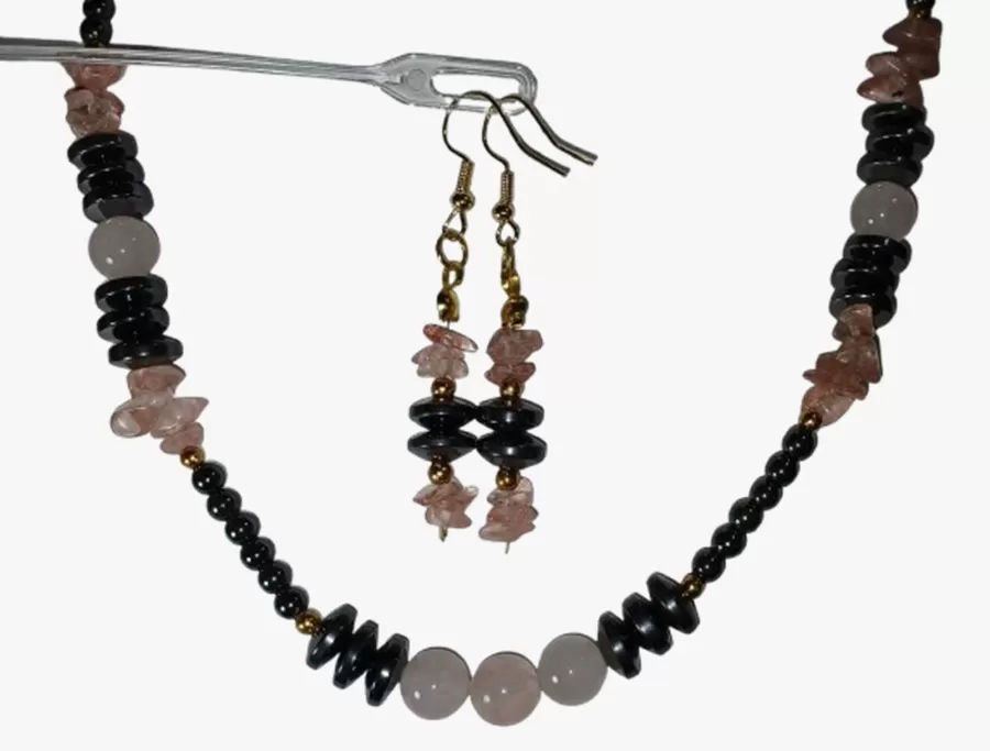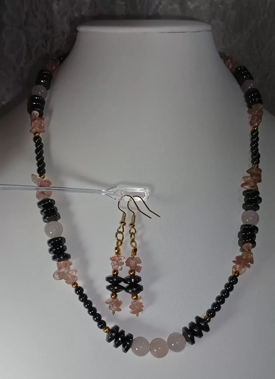 Colar Pedras Quartzo Rosa e Hematistas com Brinco Grátis.