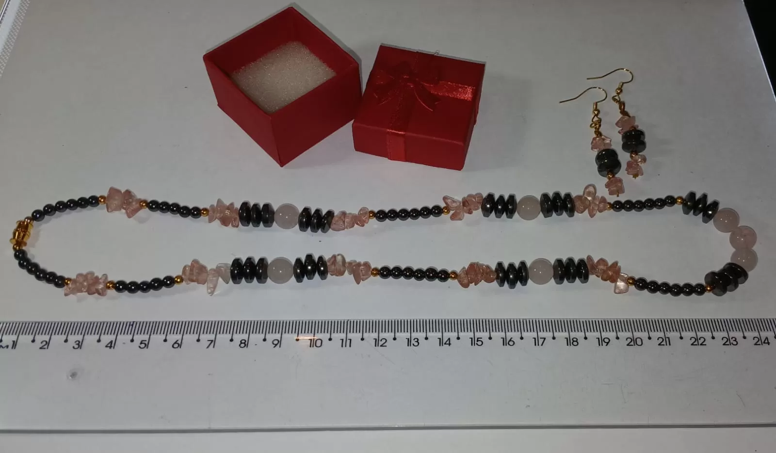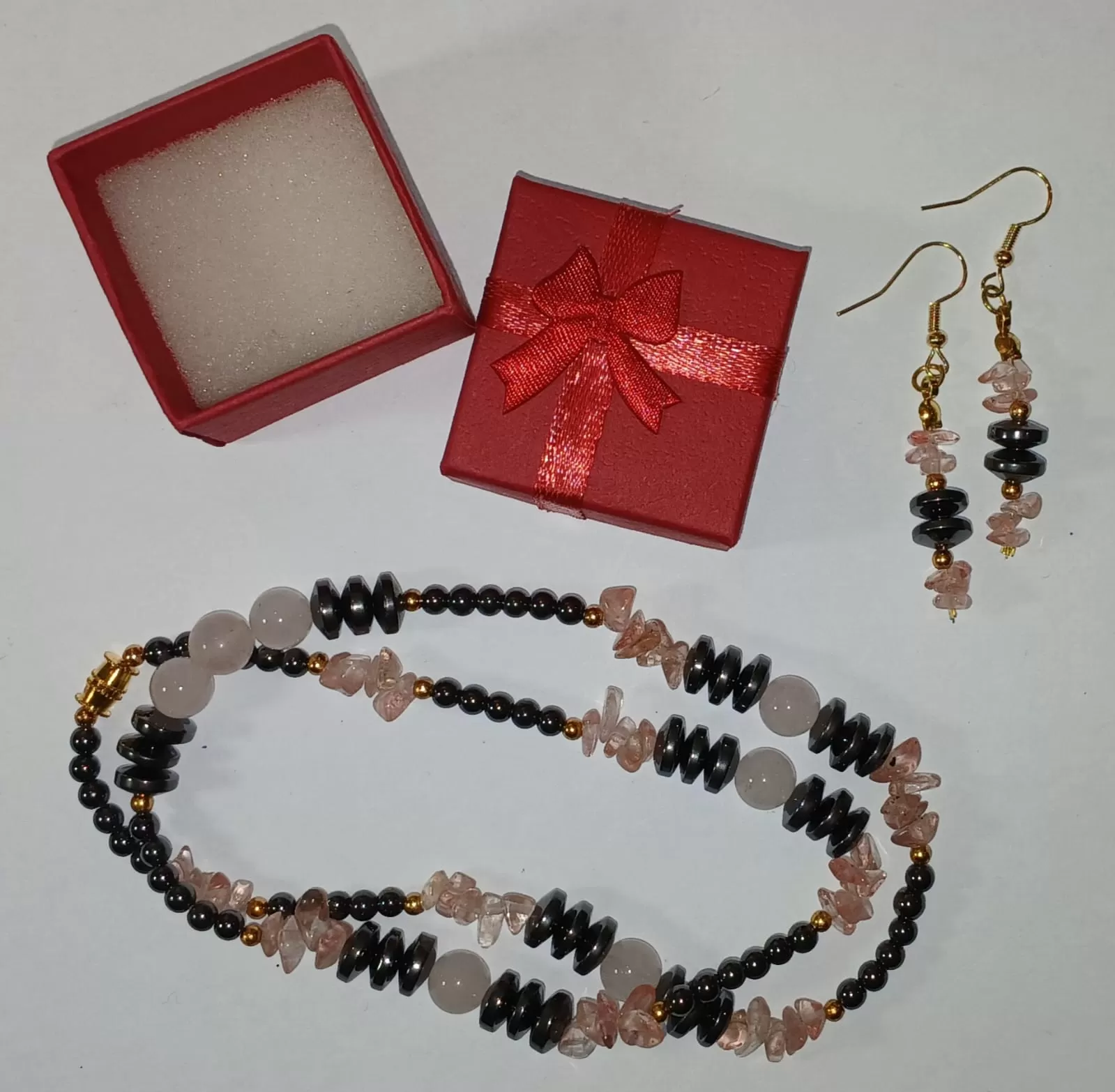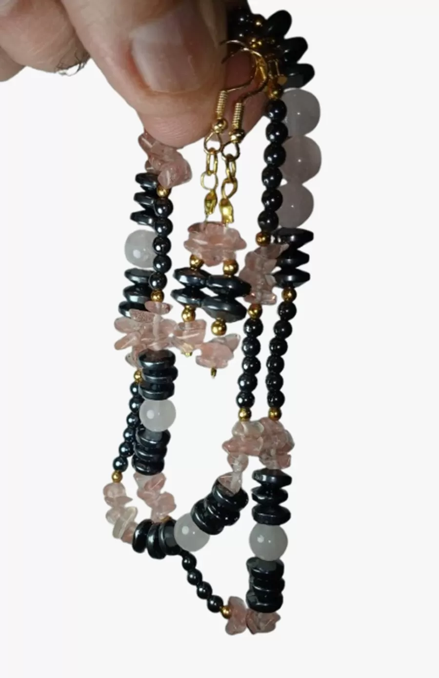 Colar Pedras Quartzo Rosa e Hematistas com Brinco Grátis.