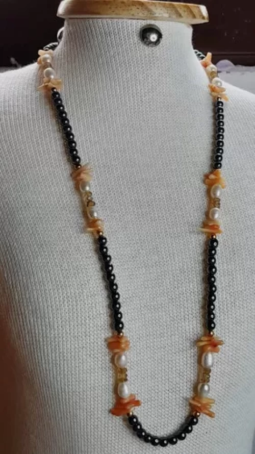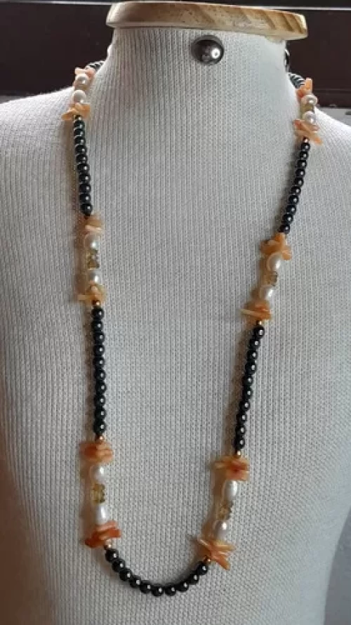 Colar de CITRINO FACETADOS, PÉROLAS NATURAIS, Coral Cascalho e Hematitas.