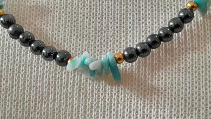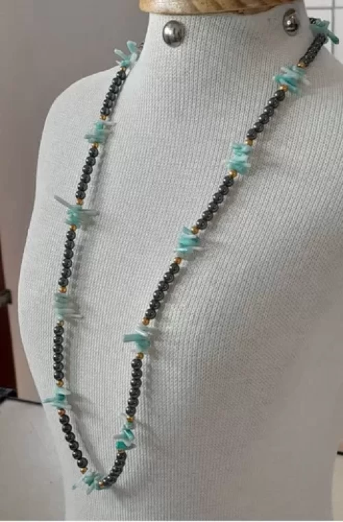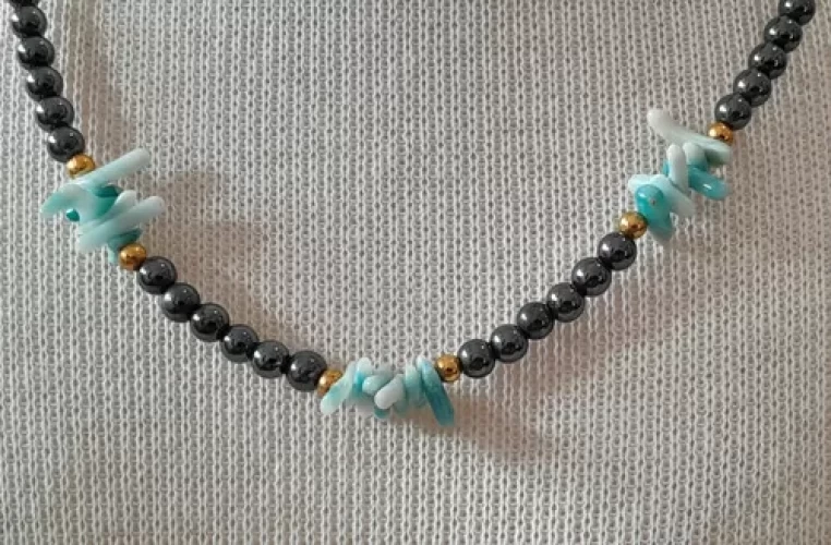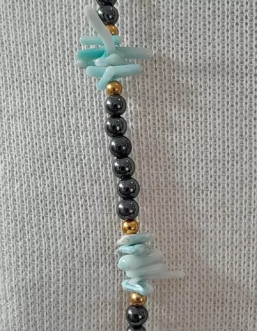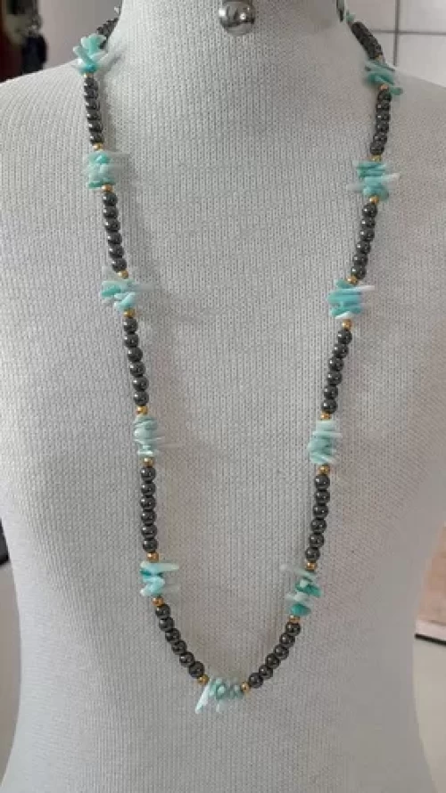 Colar de Coral Natural Verdadeiro (Pedra Orgânica) Tingido de Azul e Hematitas Metálicas 3mm. Peça Única Exclusiva Confecção Própria Artesanal.