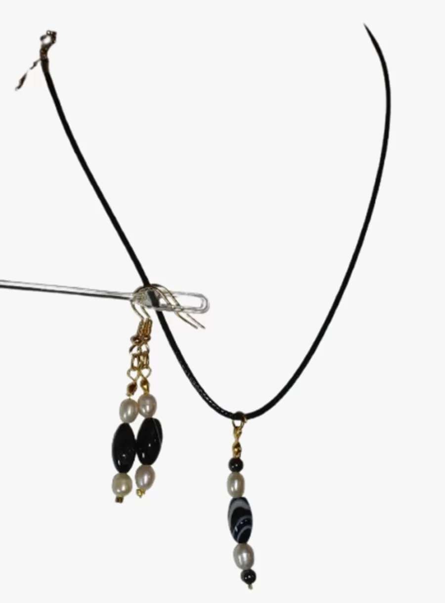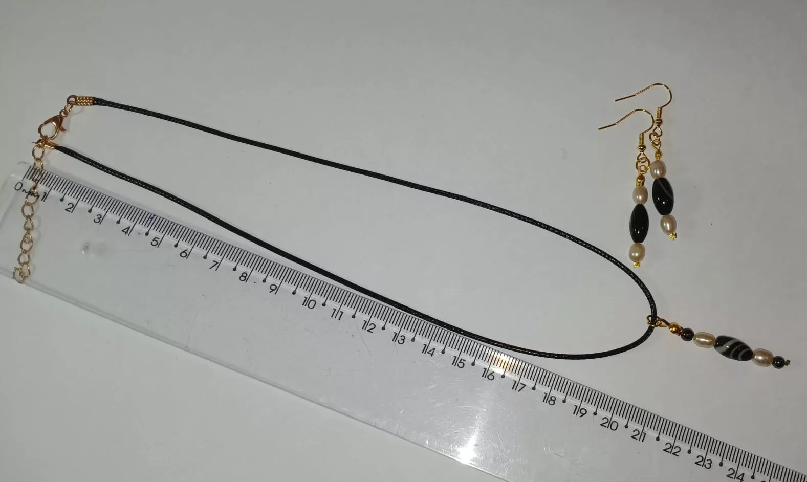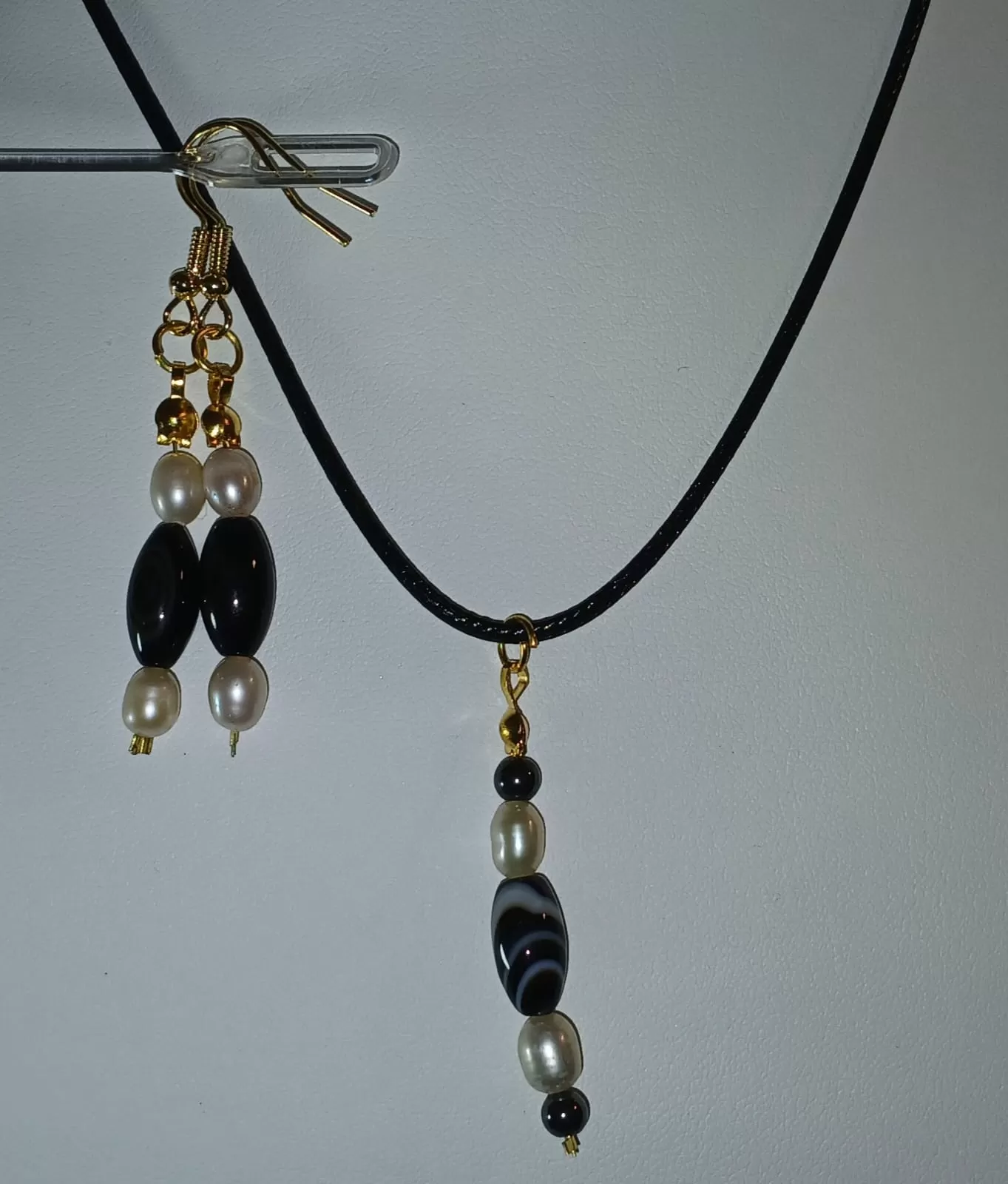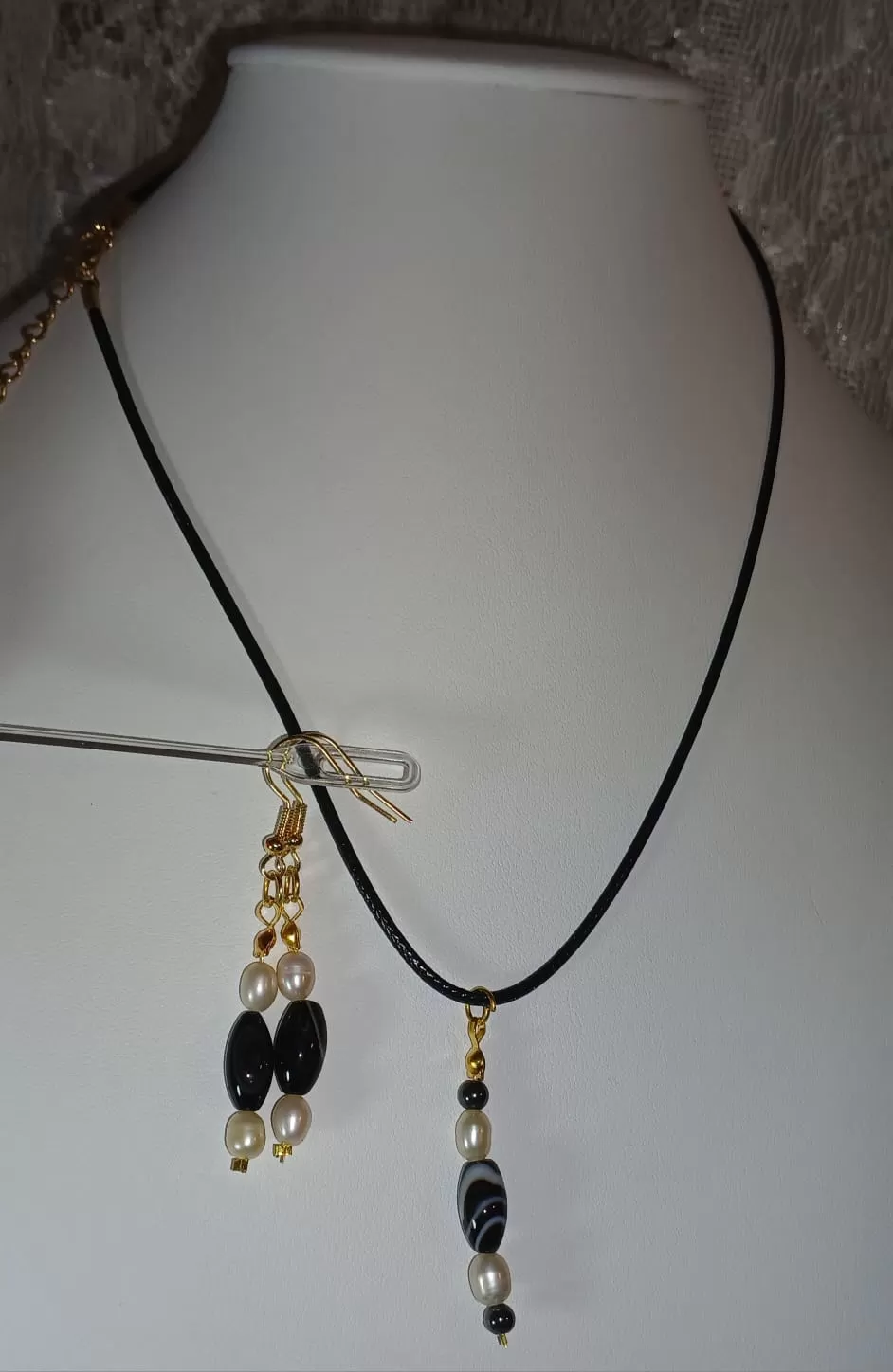 Colar Cordão Tipo Courinho com Pedras Ágata Preta Bandada e Pérolas Naturais de Água Doce + Brinco.