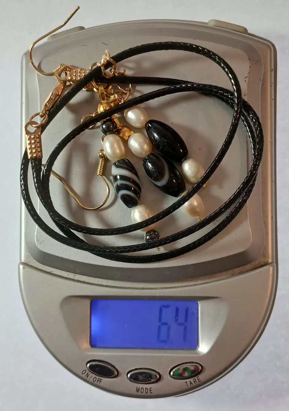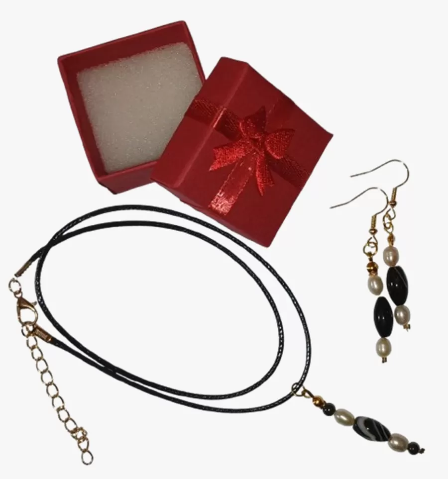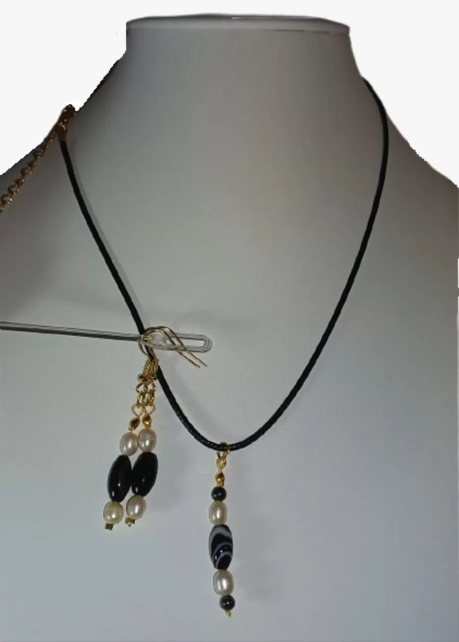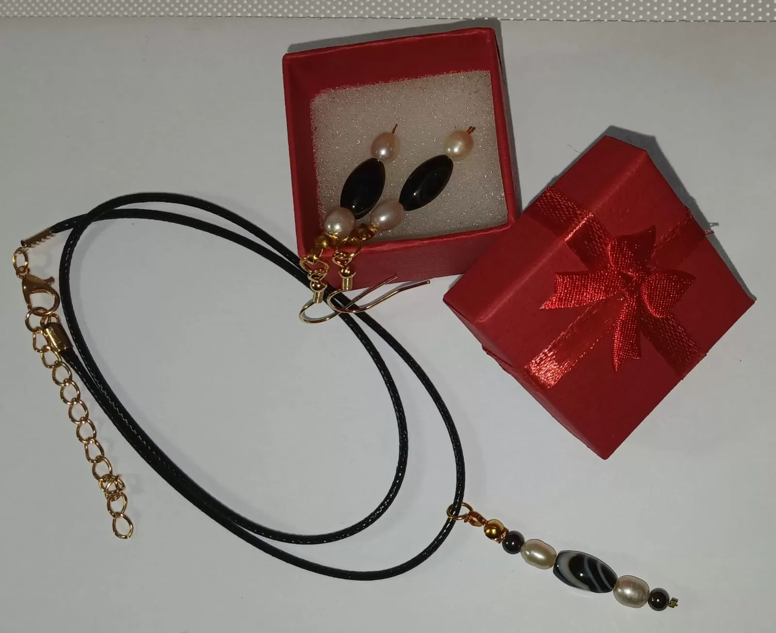 Colar Cordão Tipo Courinho com Pedras Ágata Preta Bandada e Pérolas Naturais de Água Doce + Brinco.