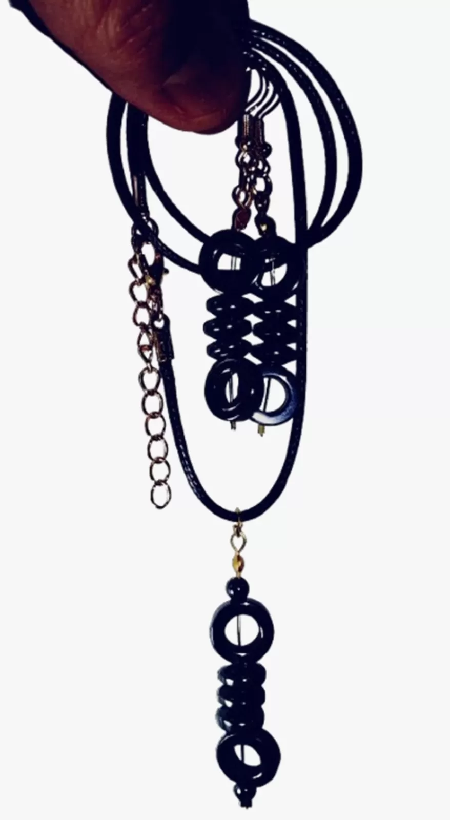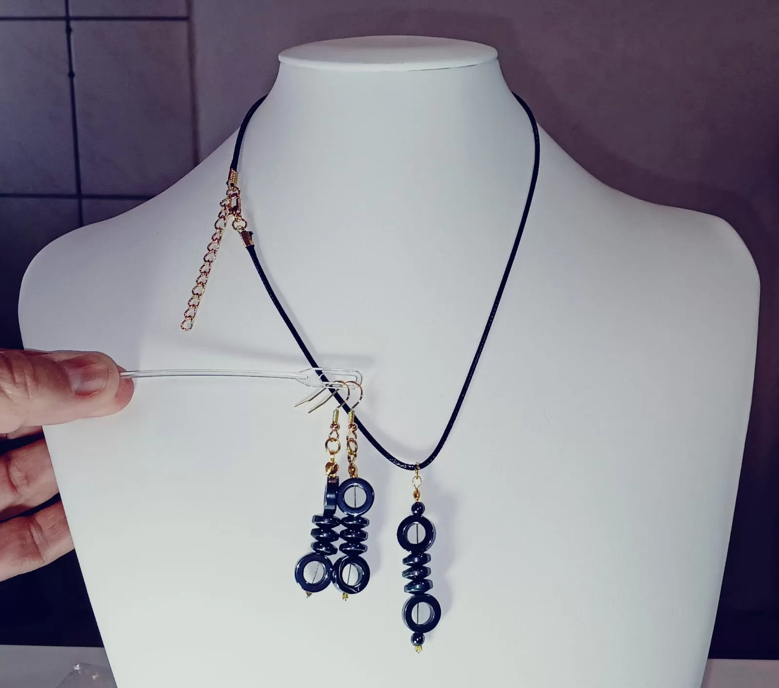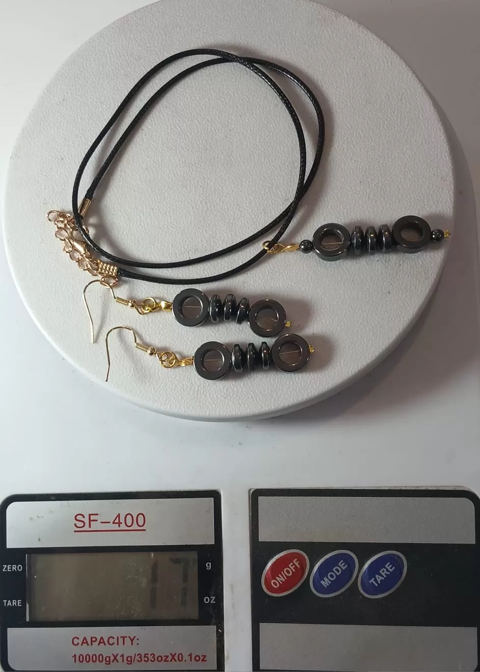 Colar Cordão Tipo Courinho Pedras Hematitas com Brinco e Pingente.