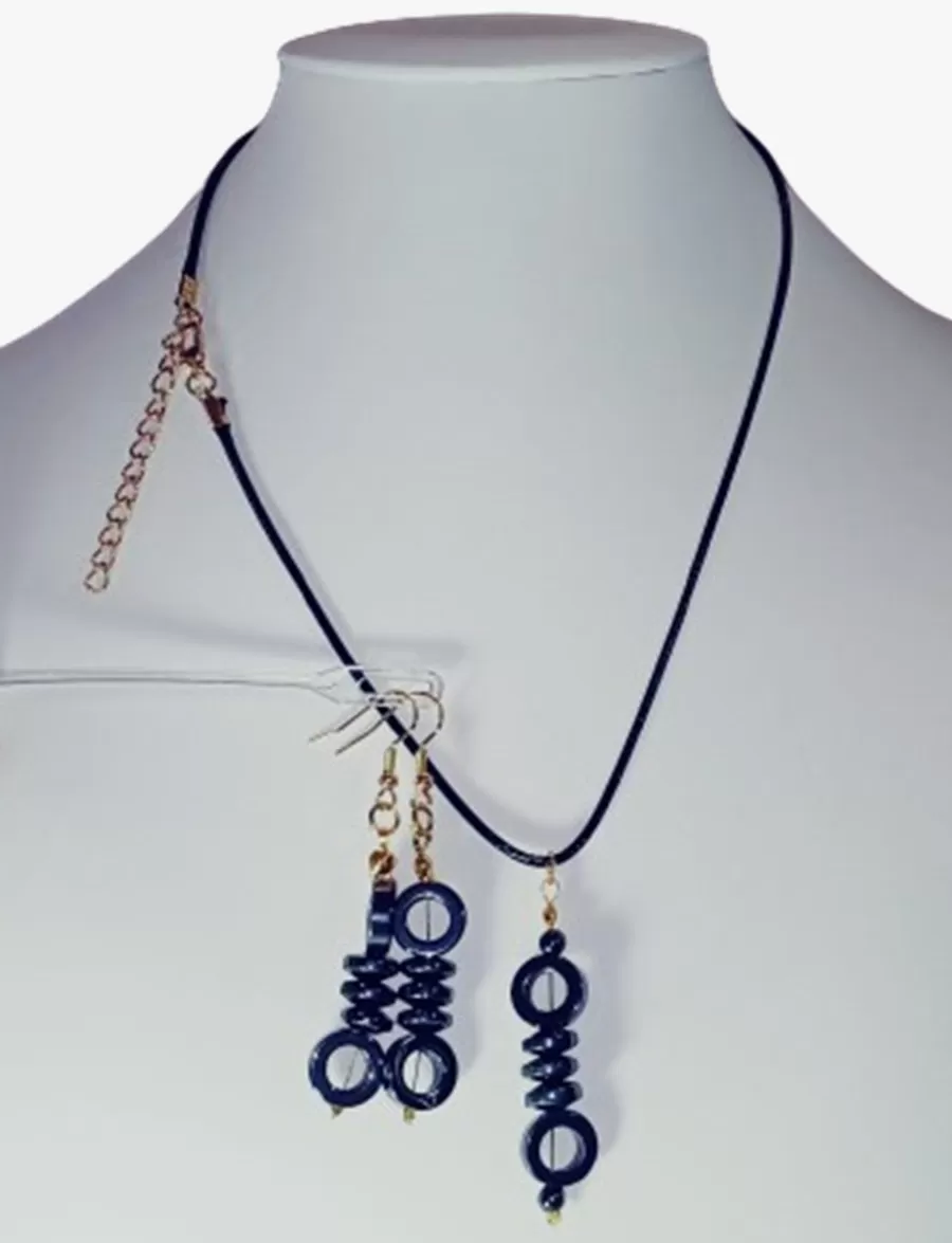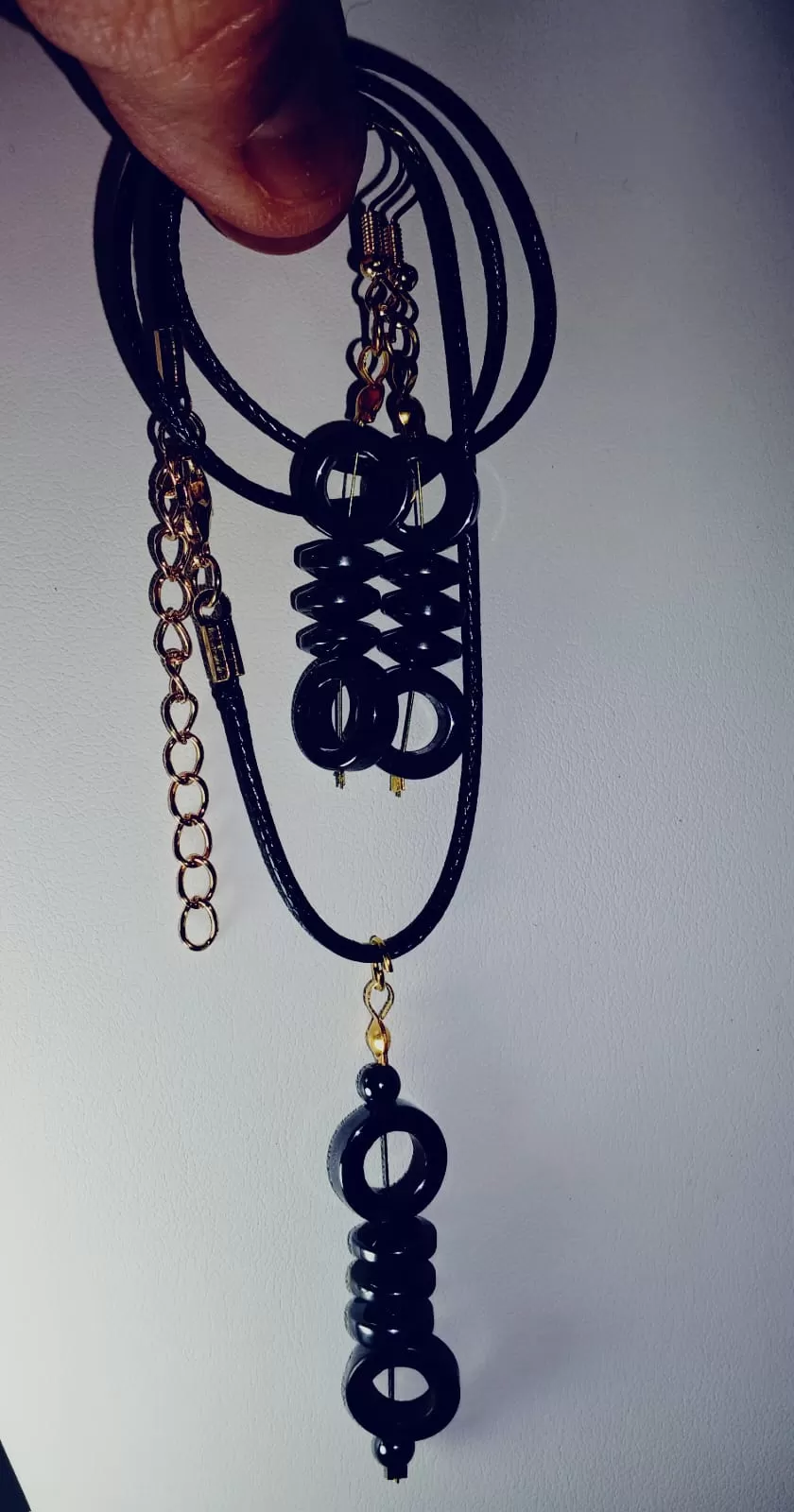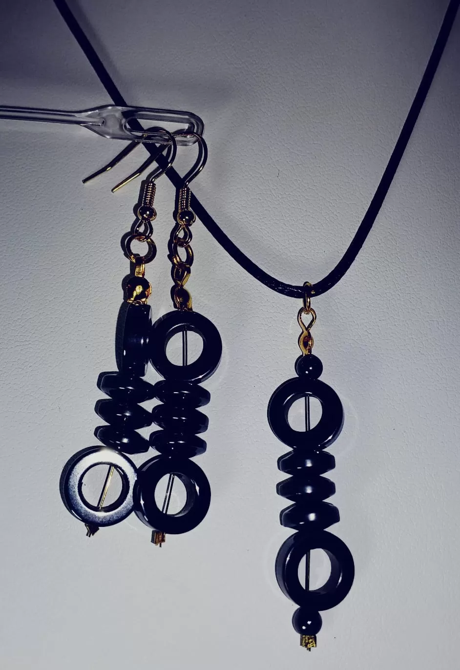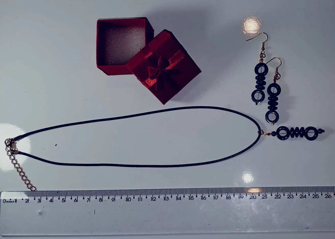 Colar Cordão Tipo Courinho Pedras Hematitas com Brinco e Pingente.