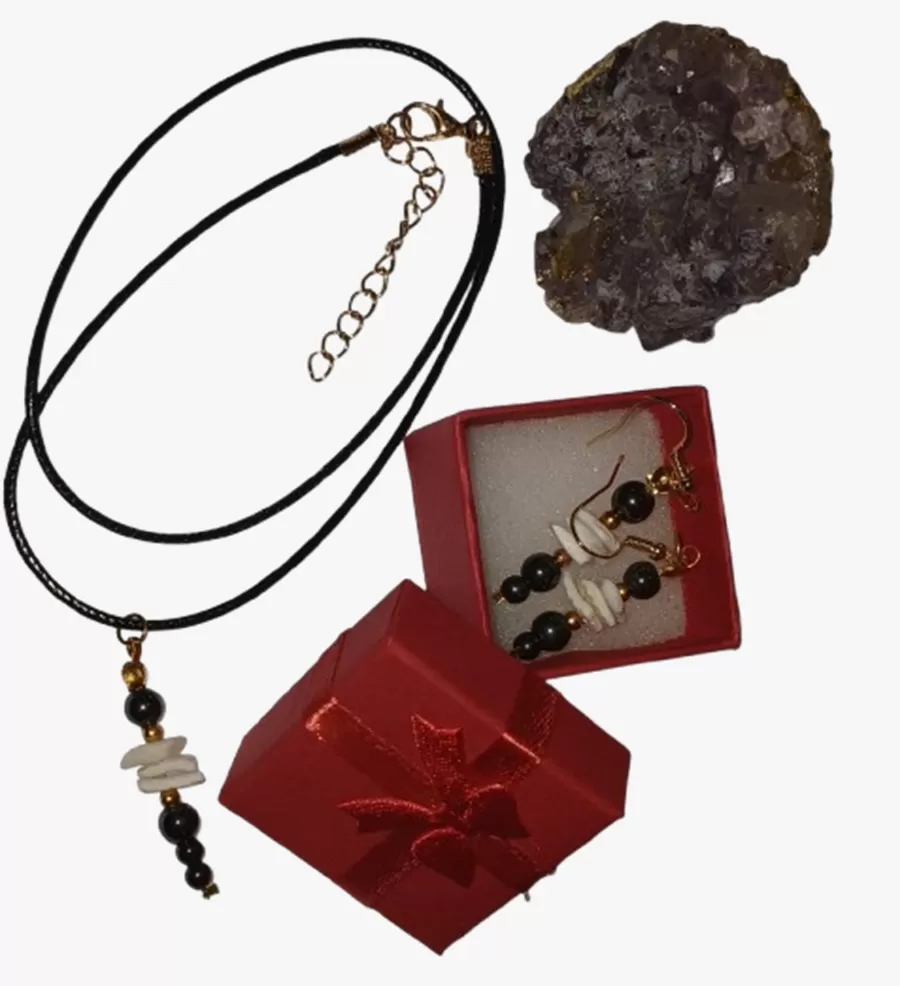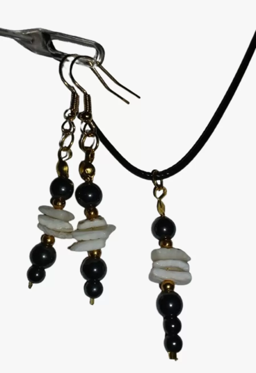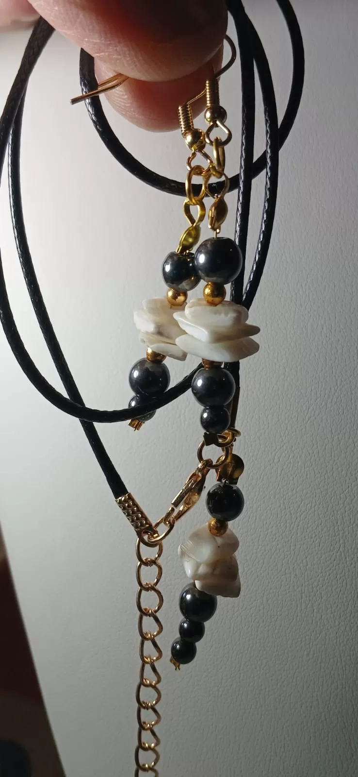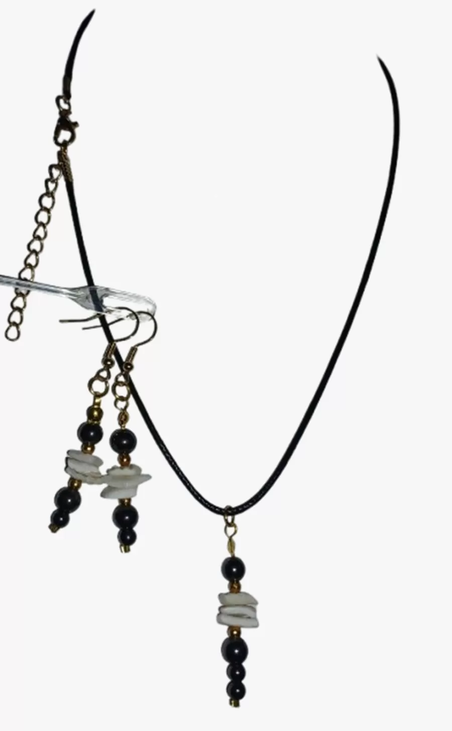 Colar Cordão Tipo Courinho com Conchinhas Brancas do Mar e Hematitas + Brinco e Pingente.