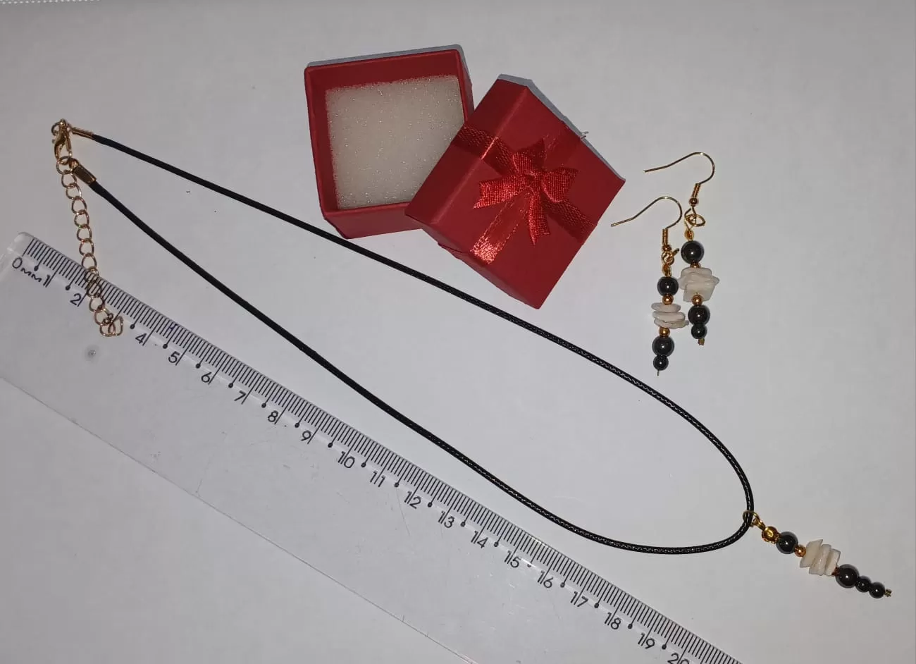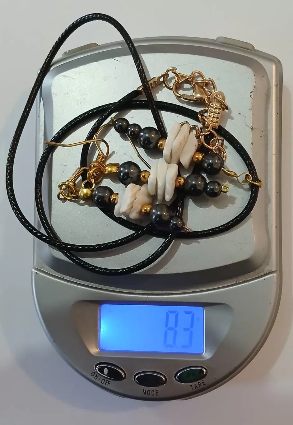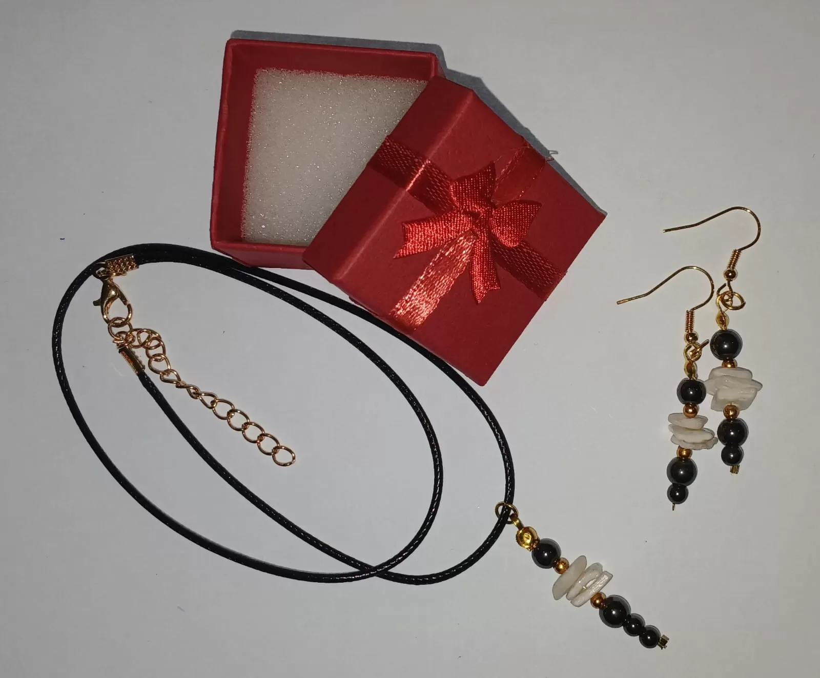 Colar Cordão Tipo Courinho com Conchinhas Brancas do Mar e Hematitas + Brinco e Pingente.