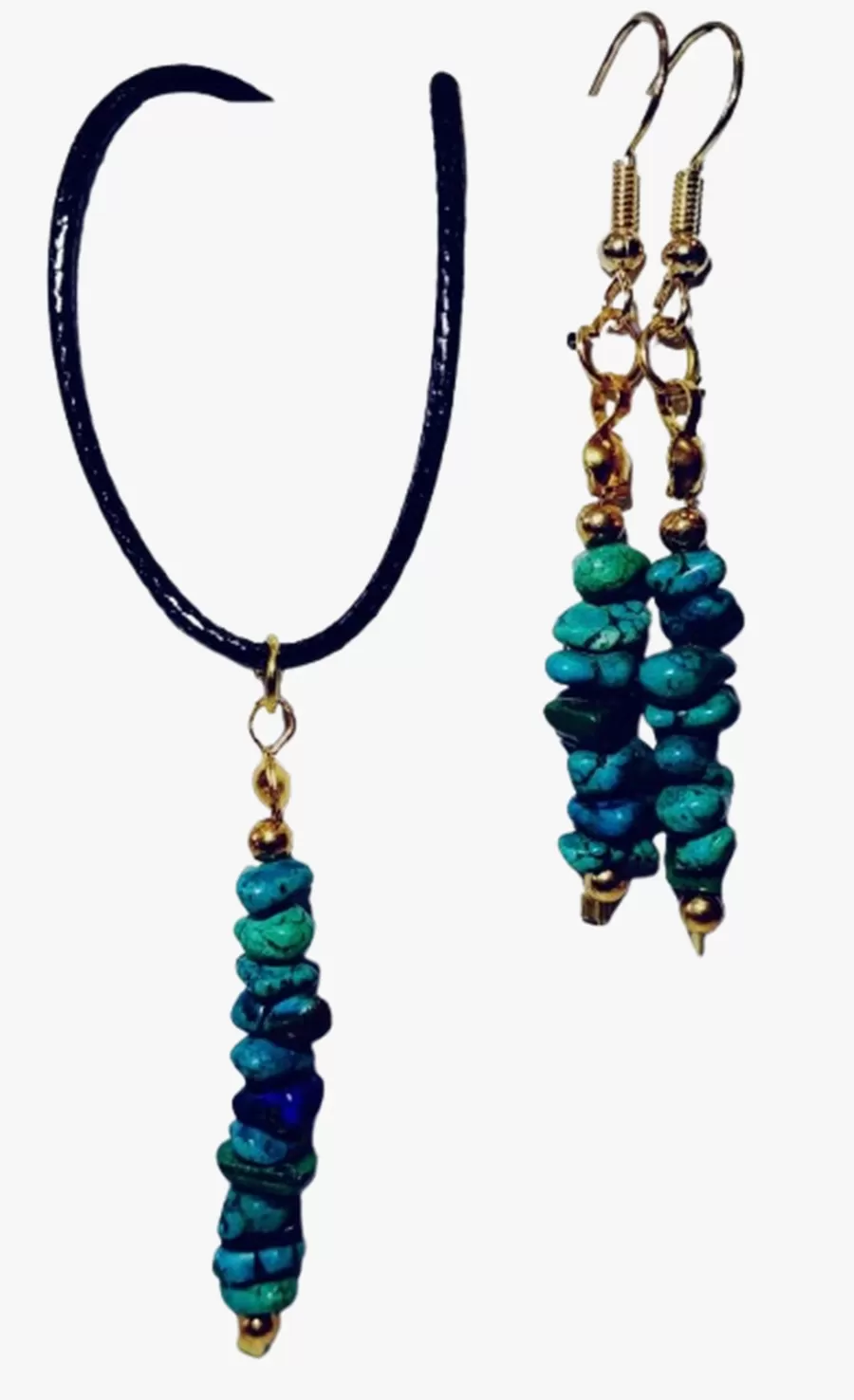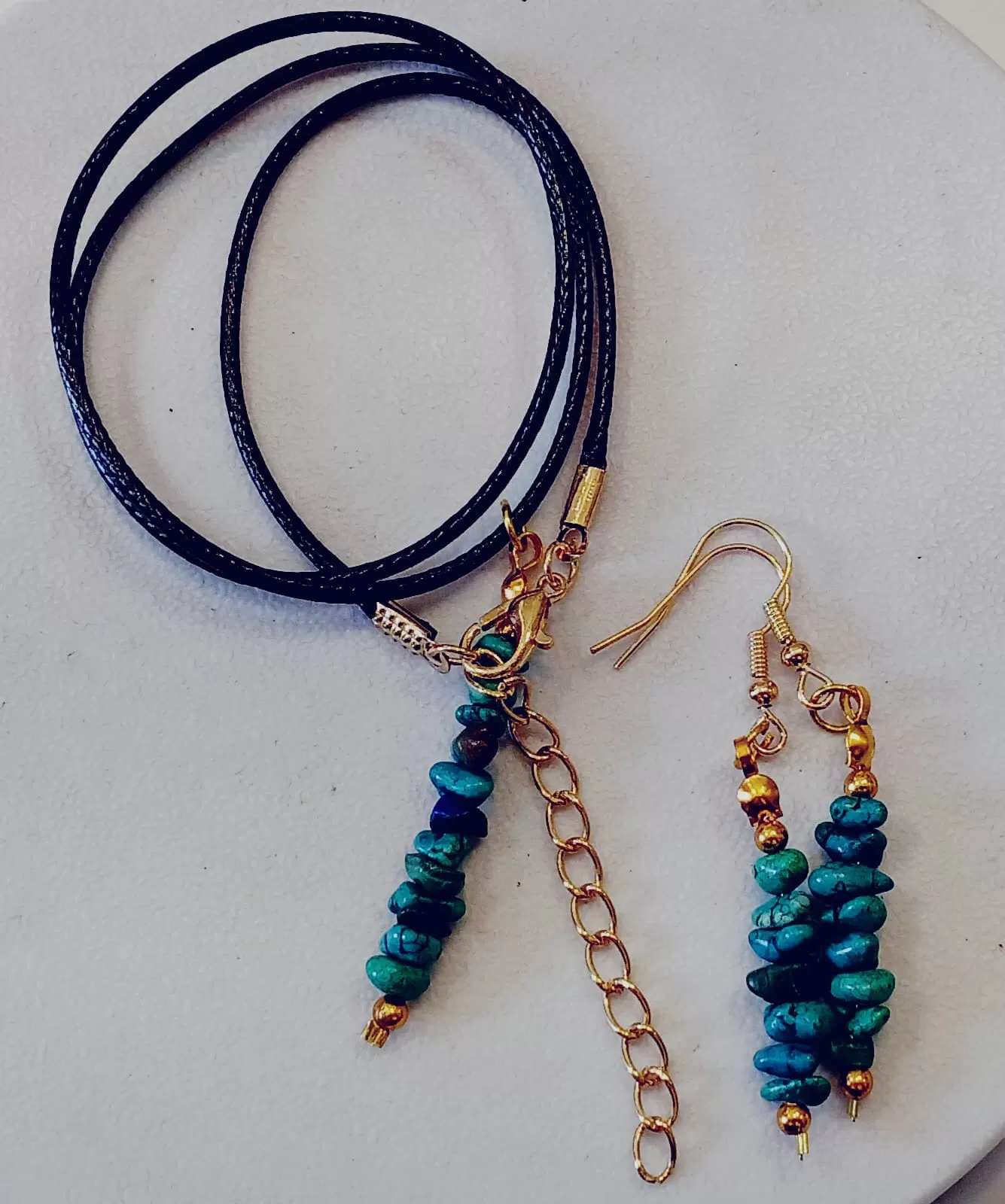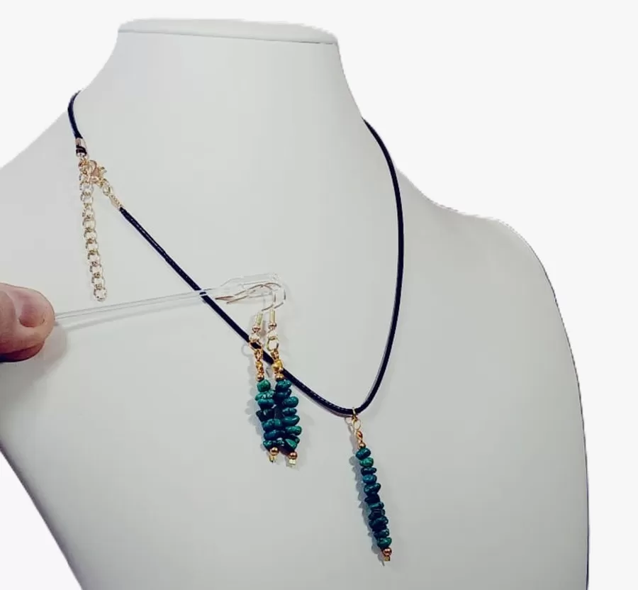 Colar Cordão Tipo Courinho com Pedras Malaquitas com Pingente e Brincos