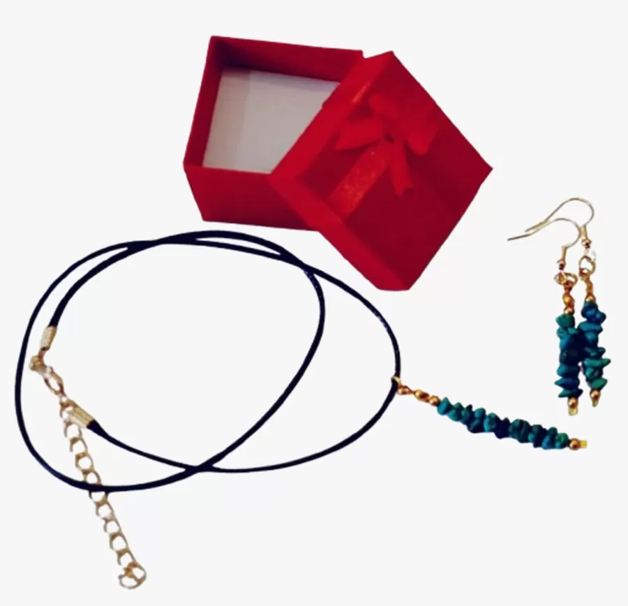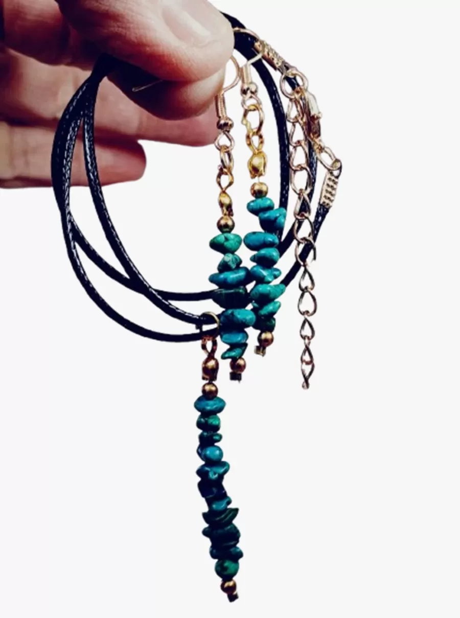 Colar Cordão Courinho Pedras Malaquitas com Pingente e Brincos