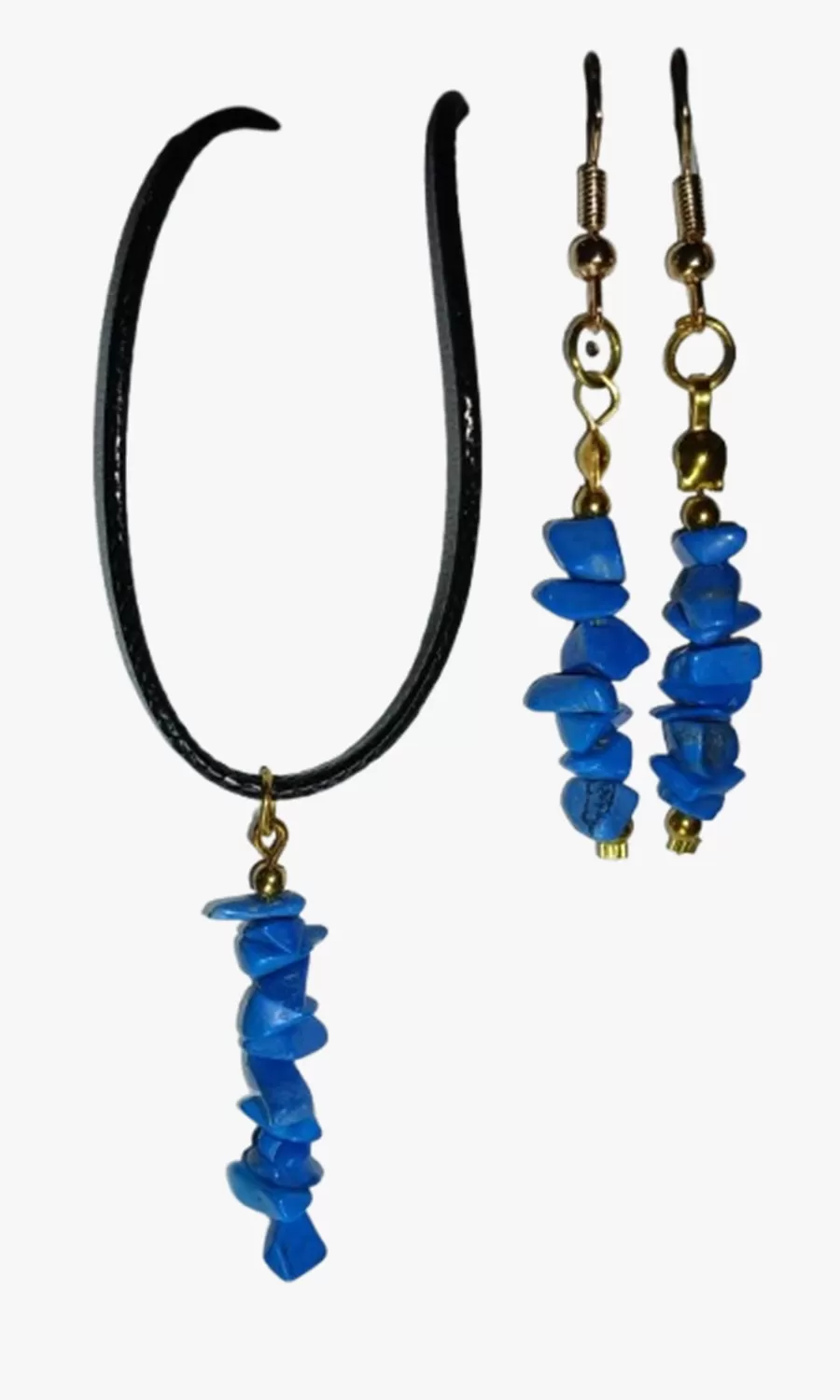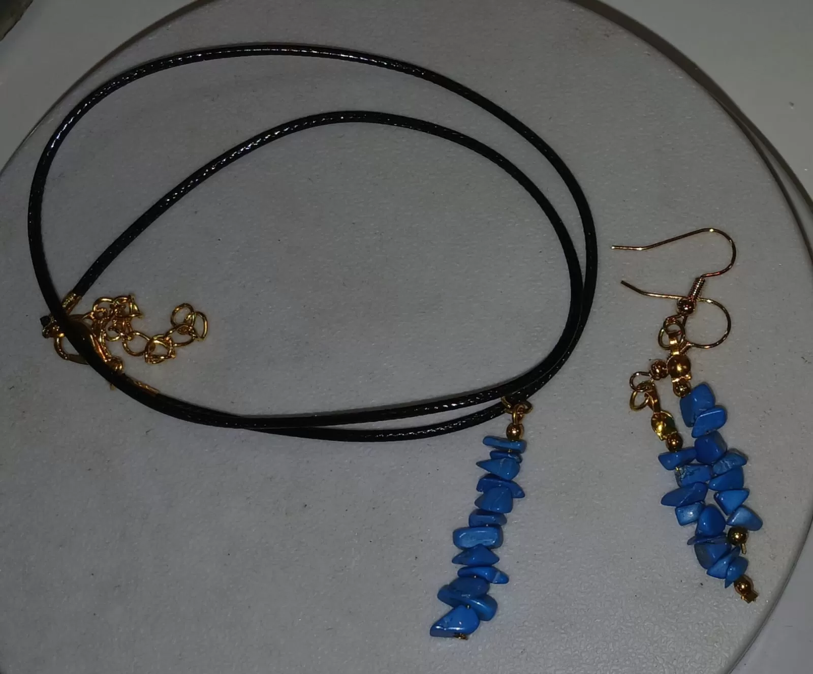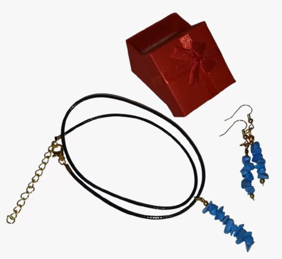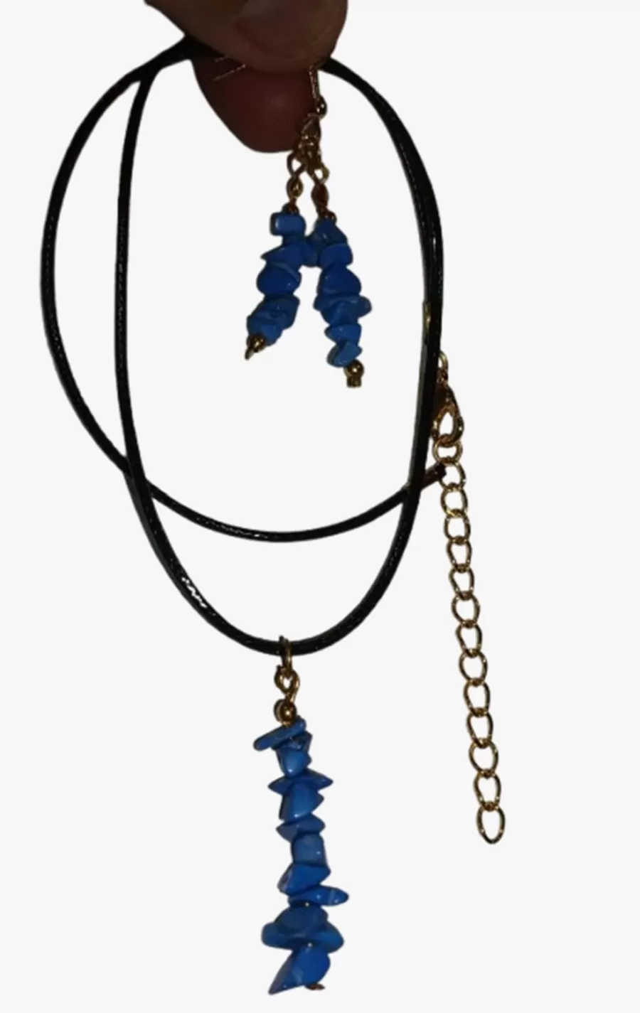 Colar Cordão Tipo Courinho Pedras Naturais Turquesa com Brinco e Pingente