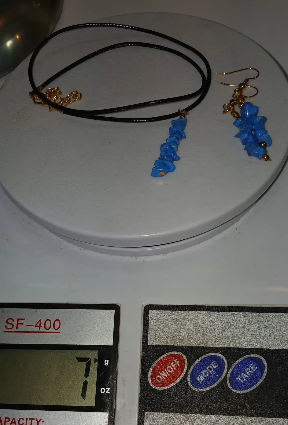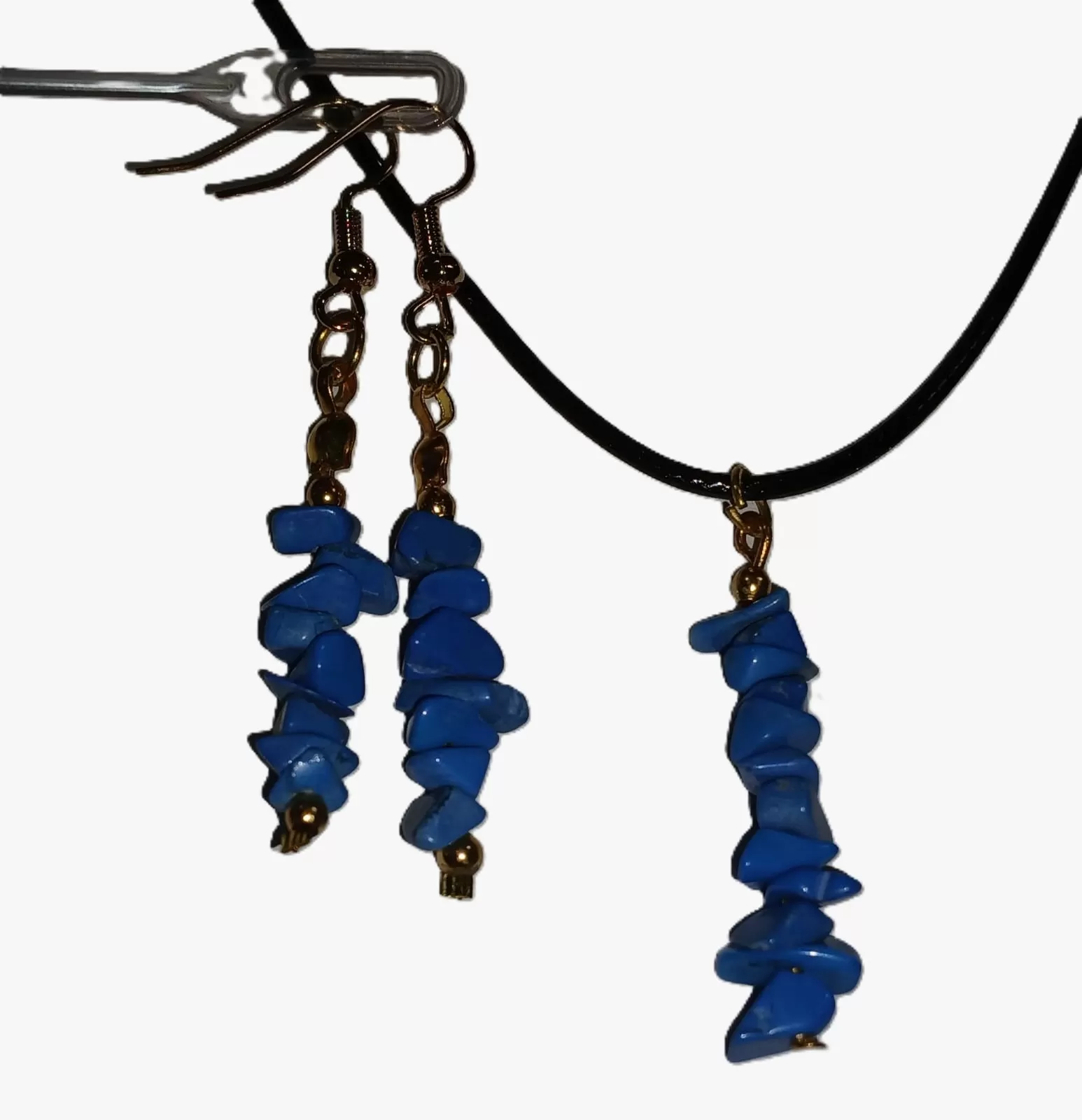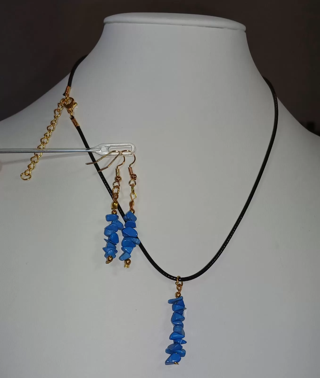 Colar Cordão Tipo Courinho Pedras Naturais Turquesa com Brinco e Pingente