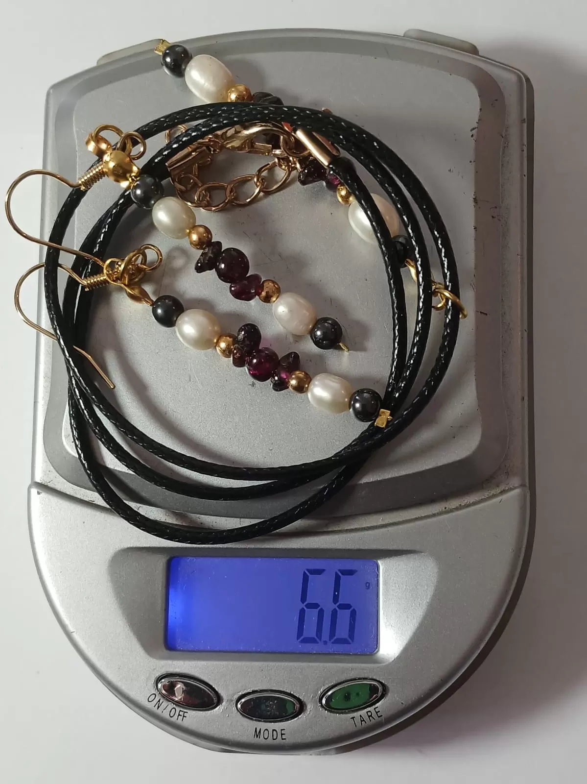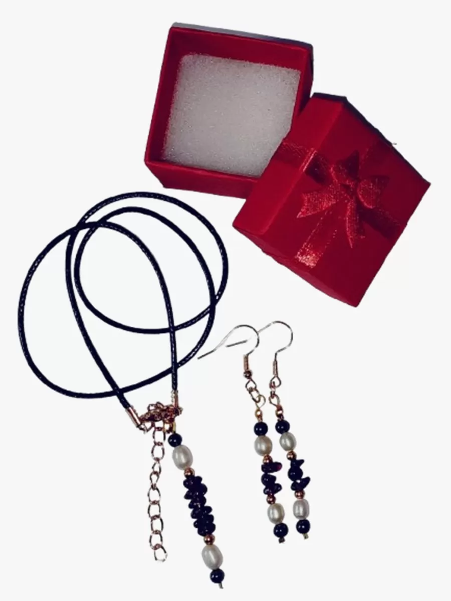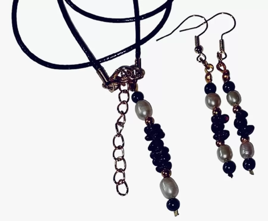 Cordão Pedras Granadas Vinho, Pérolas Naturais e Hematitas 3mm com Pingente e Brincos.
