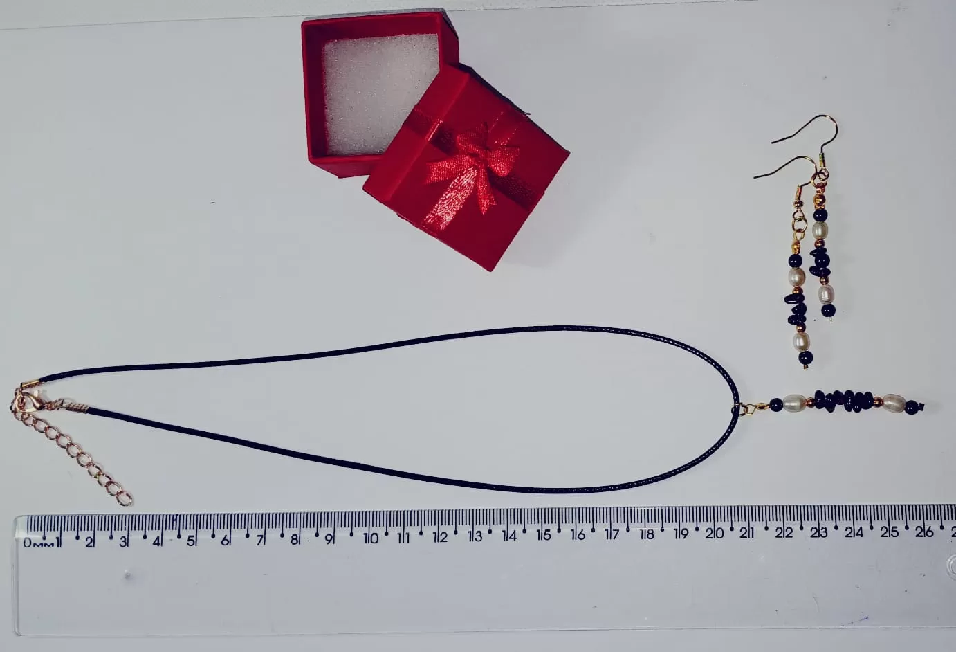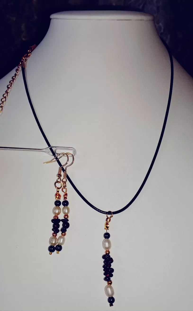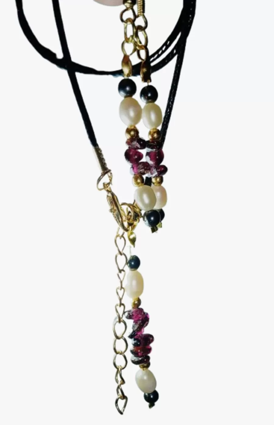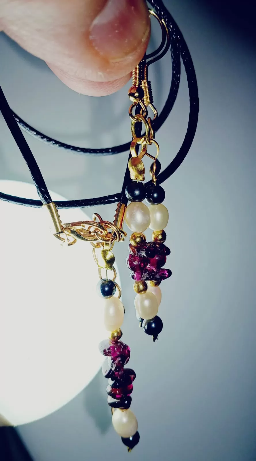 Colar Cordão Tipo Courinho Pedras Granadas Vinho, Pérolas Naturais de Água Doce e Hematitas 3mm com Pingente e Brincos.