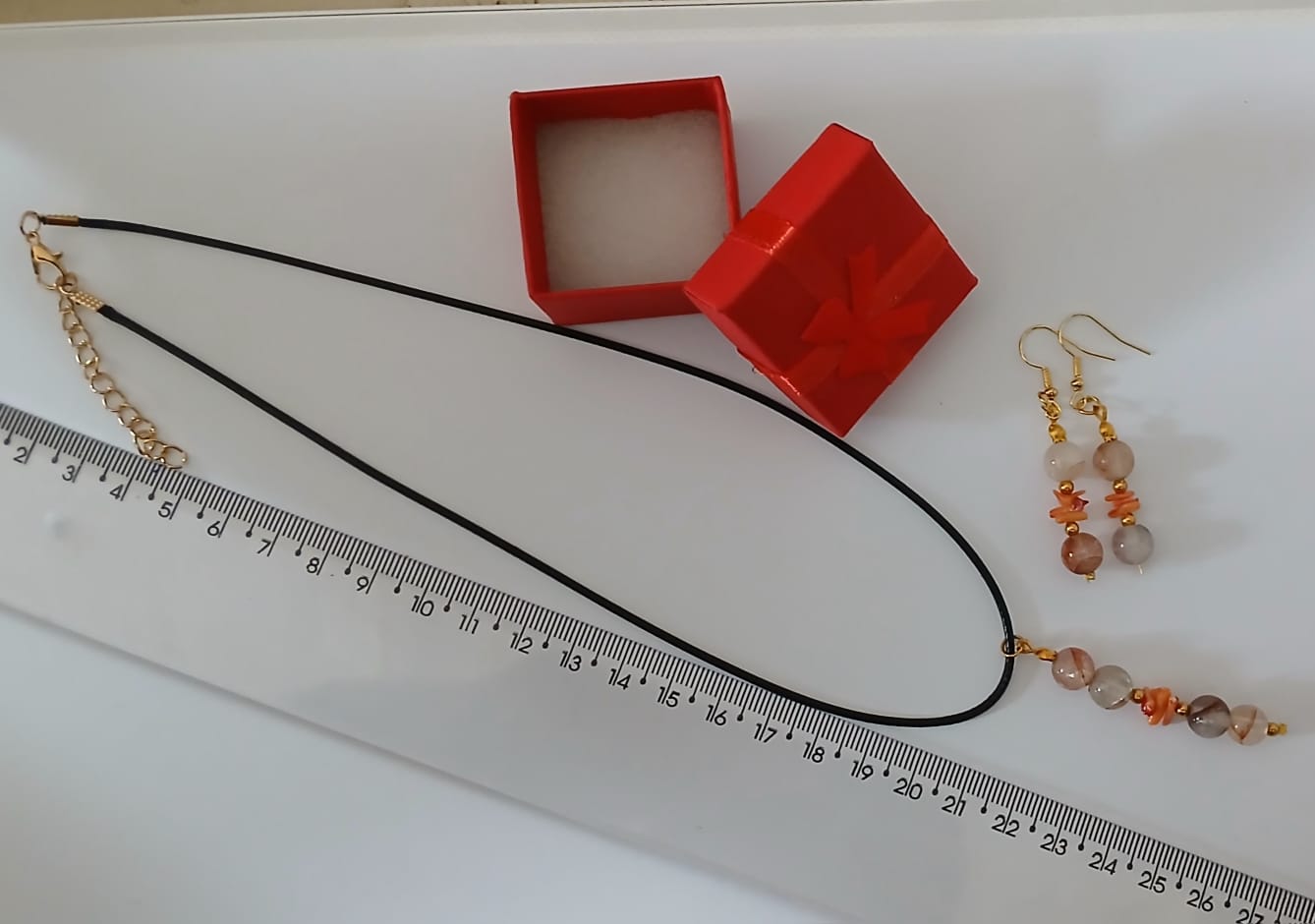 Colar aberto aprox. 50cm – Colar Fechado Aproximadamente 22cm + Pingente 5cm e Brinco 3,5cm