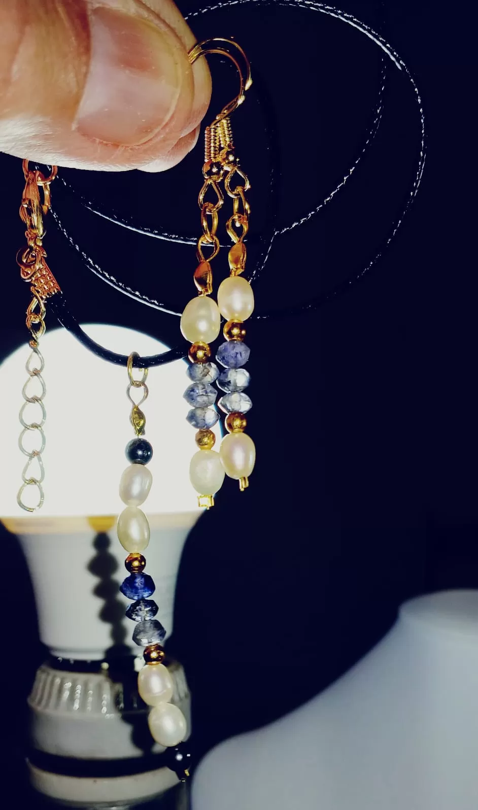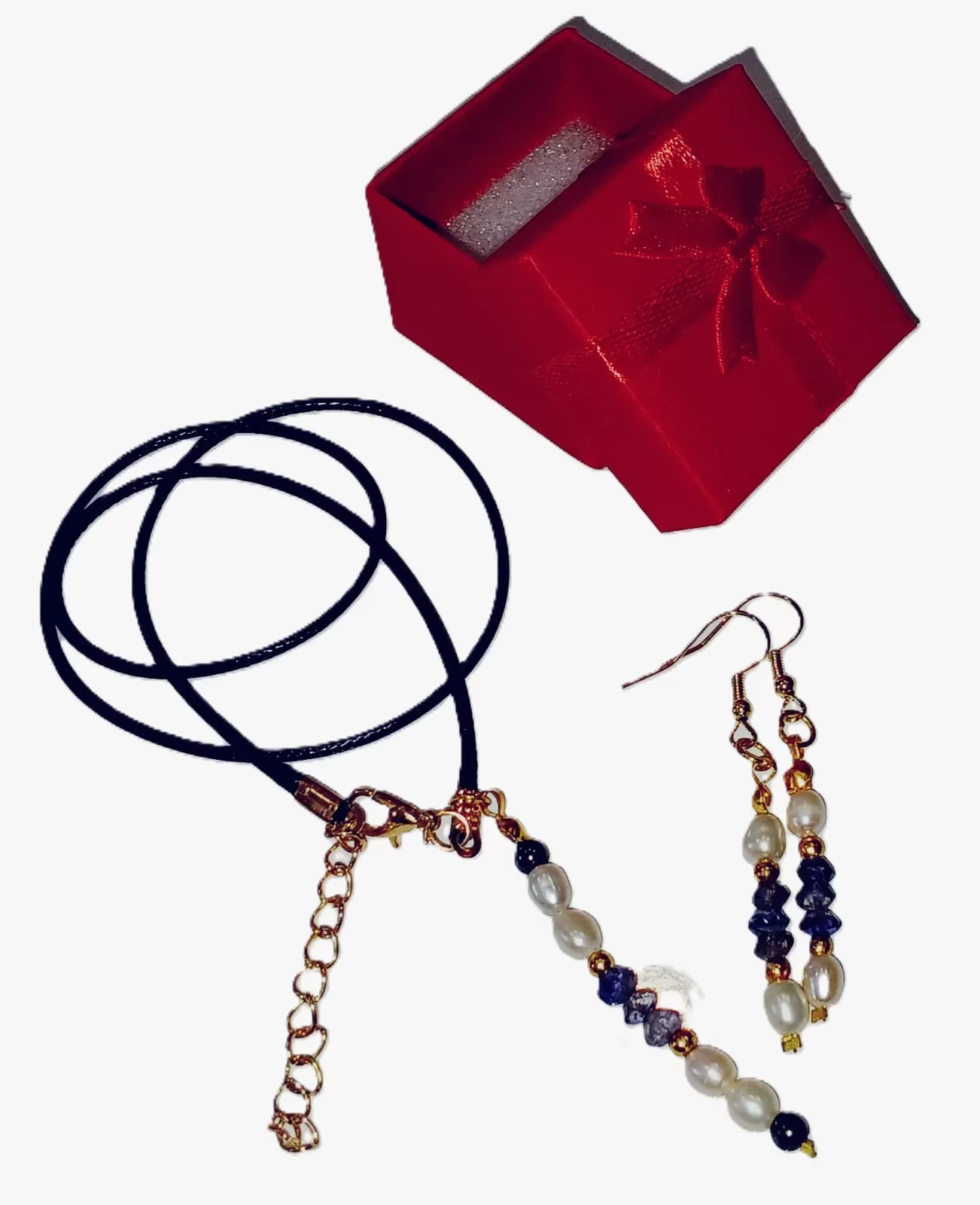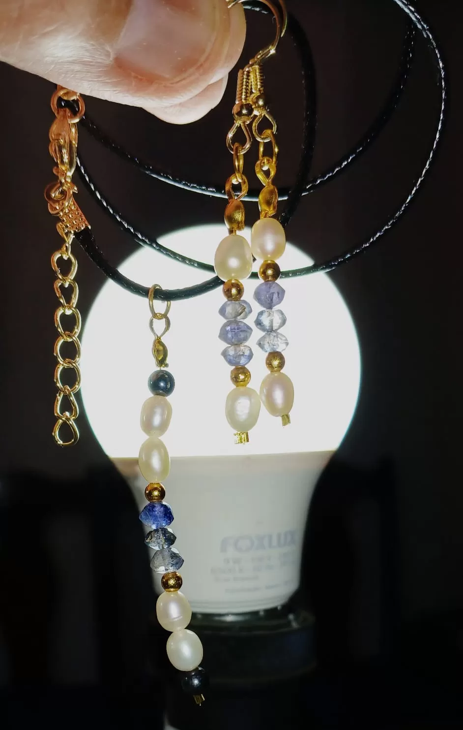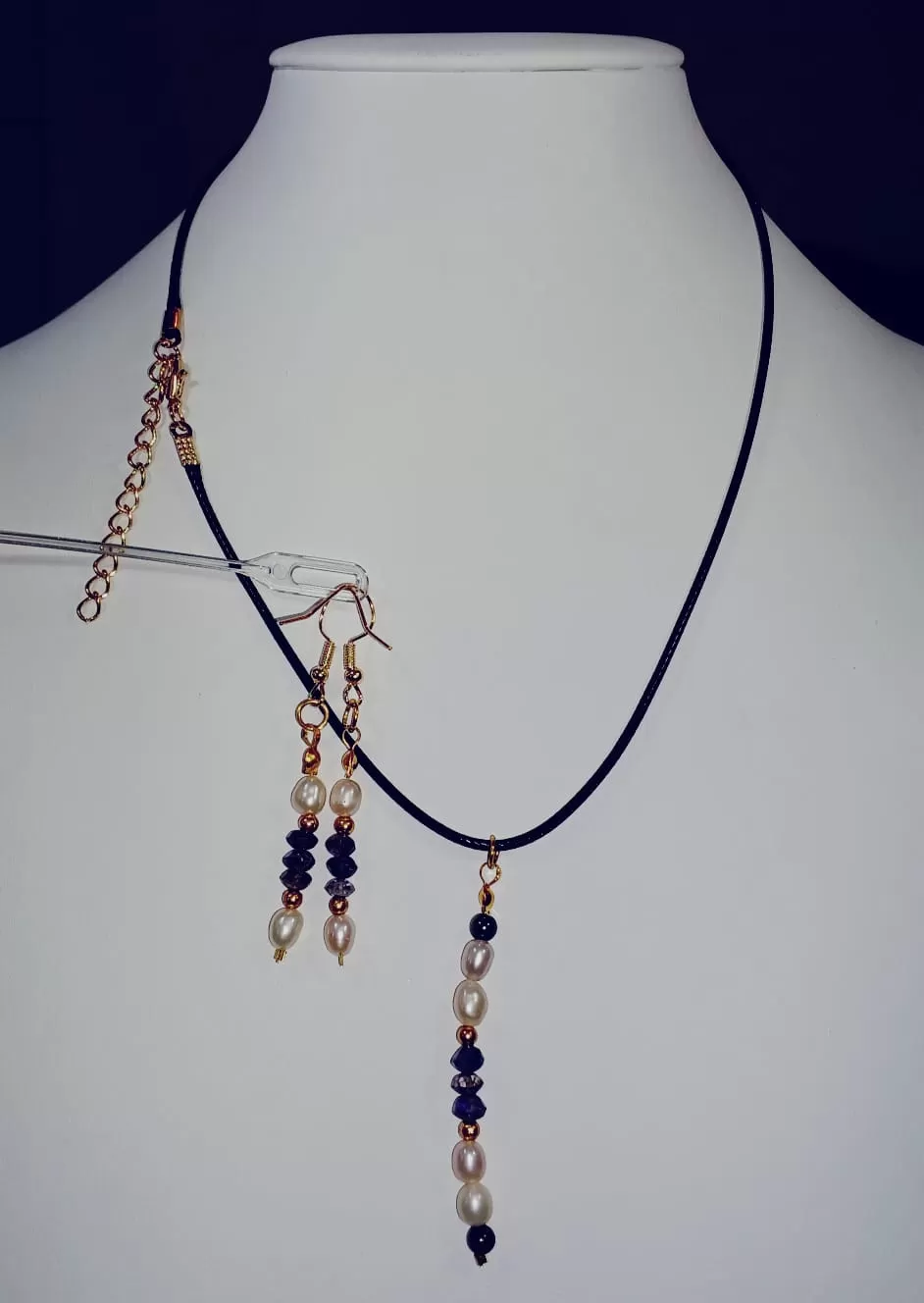 Colar Cordão Tipo Courinho Safiras Azuis, Pérolas Naturais e Hematitas + Brinco e Pingente