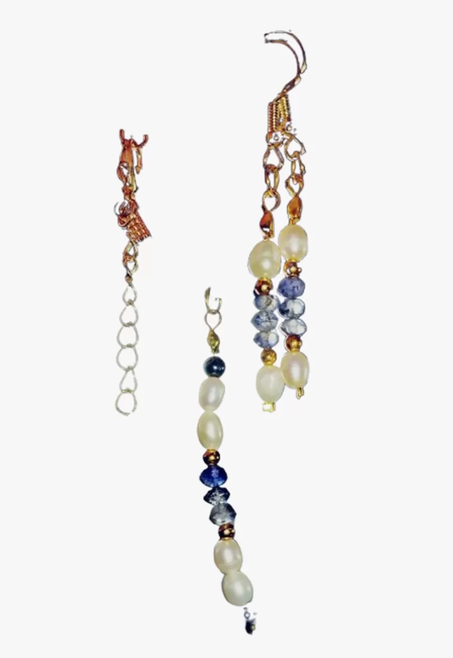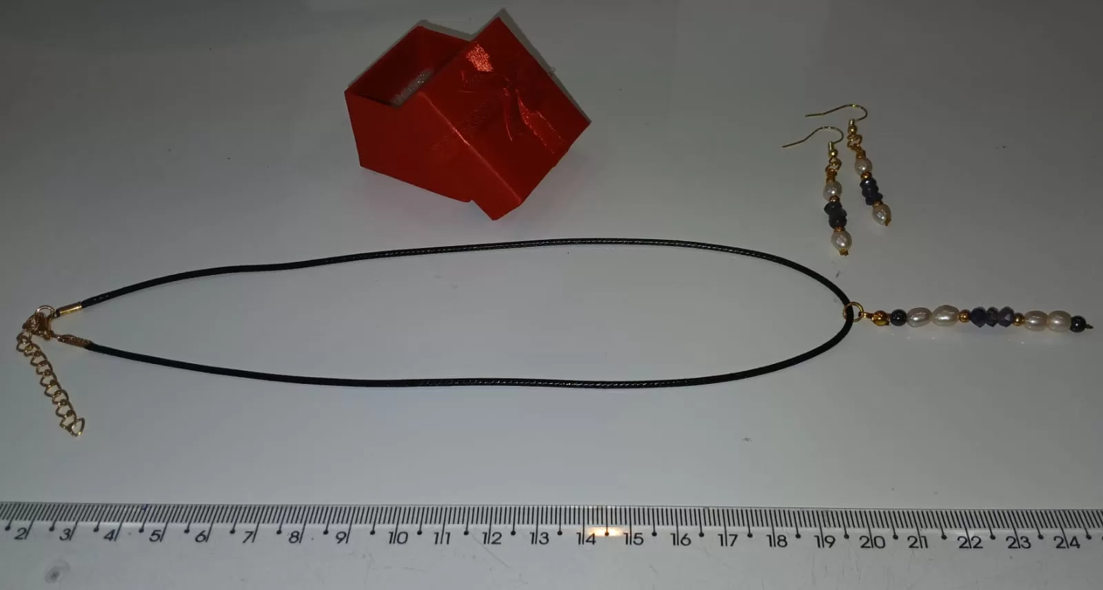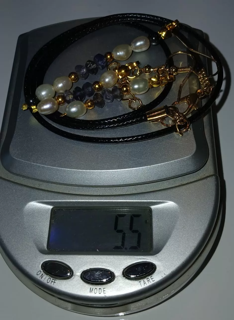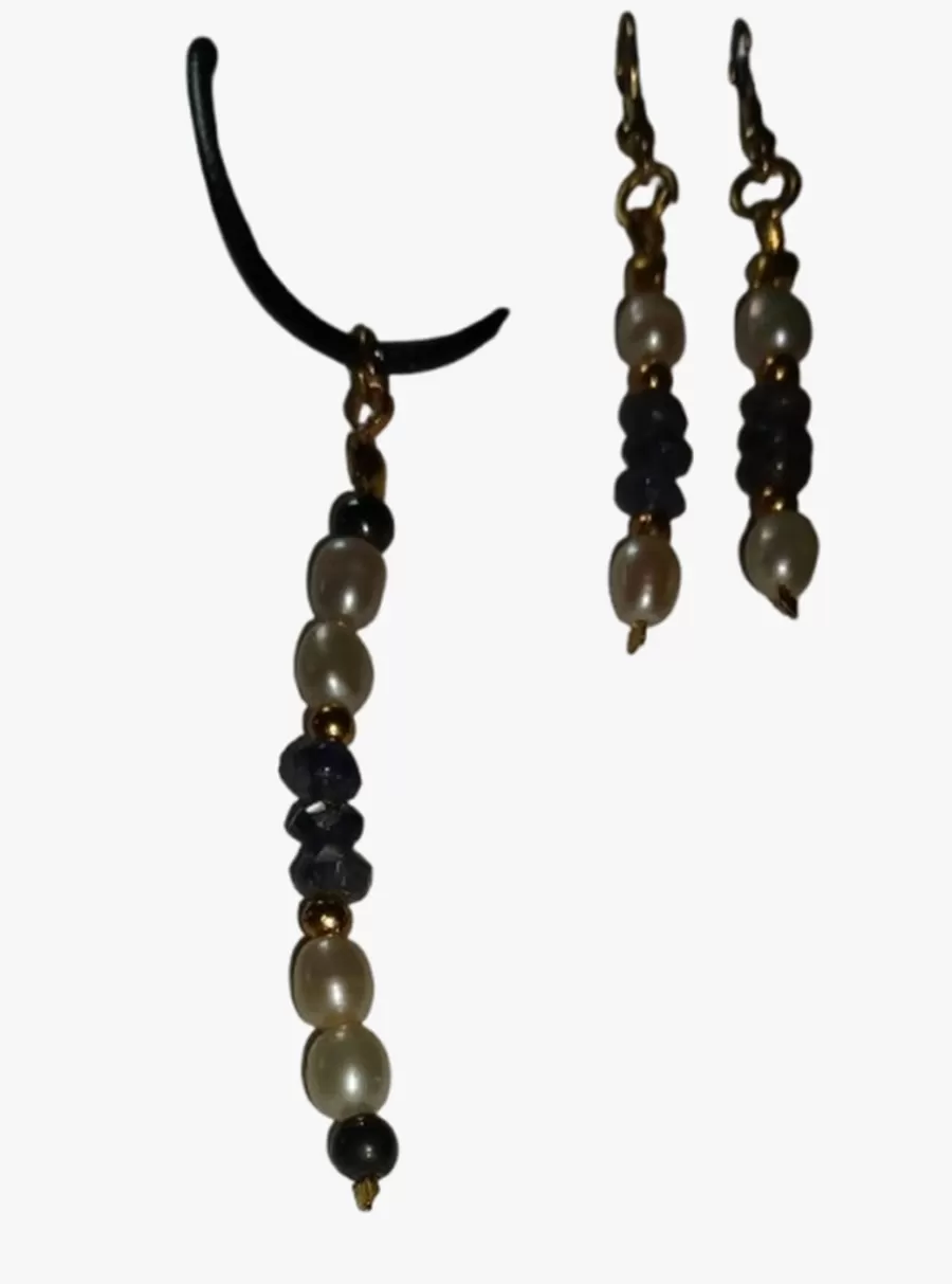 Colar Cordão Tipo Courinho Safiras Azuis, Pérolas Naturais e Hematitas + Brinco e Pingente