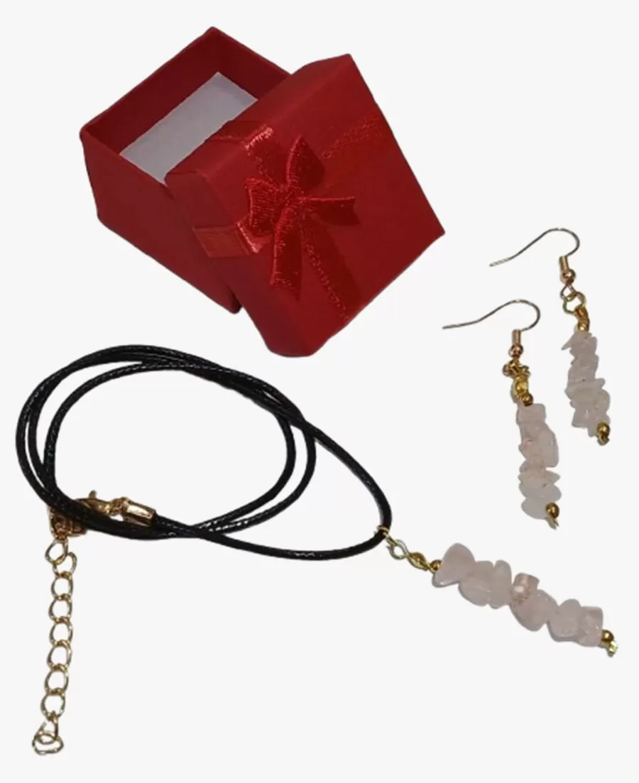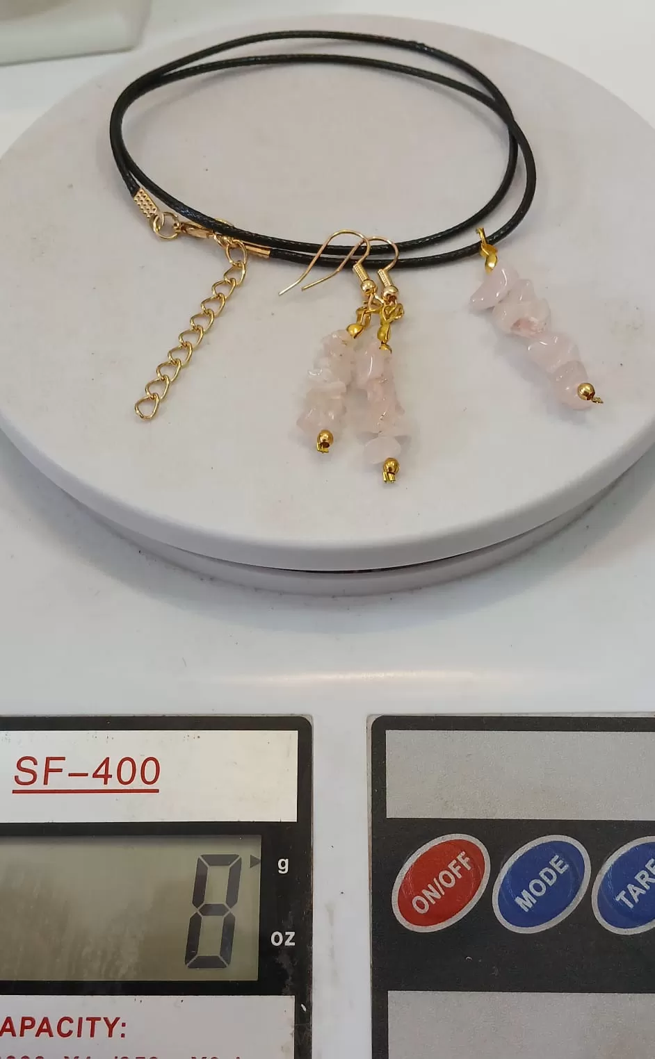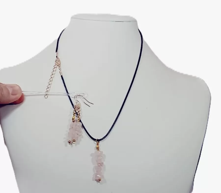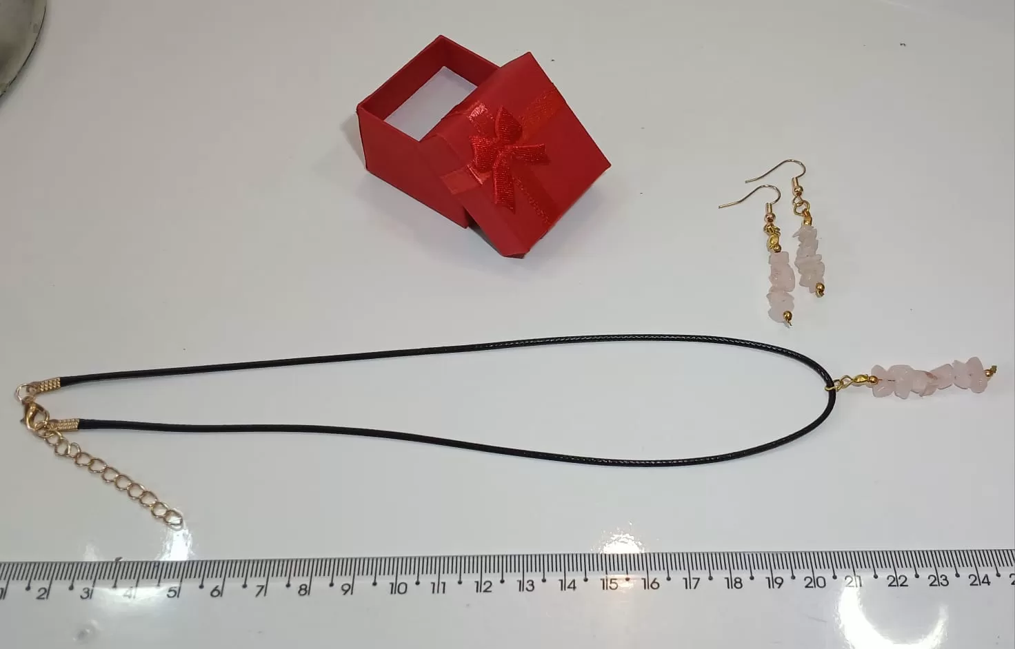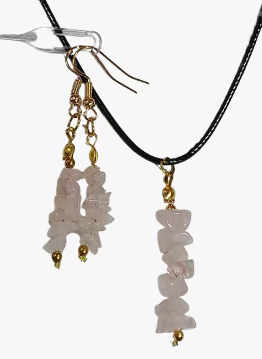 Colar Cordão Pedra Quartzo Rosa Cascalho 4° Chakra Cardíaco com Pingente e Brinco.
