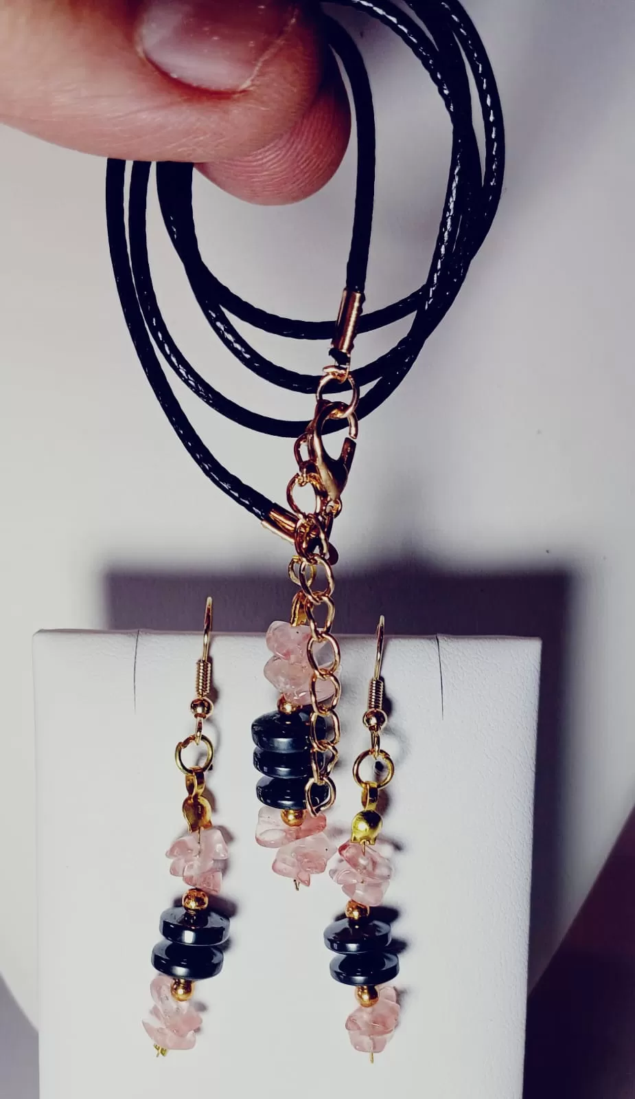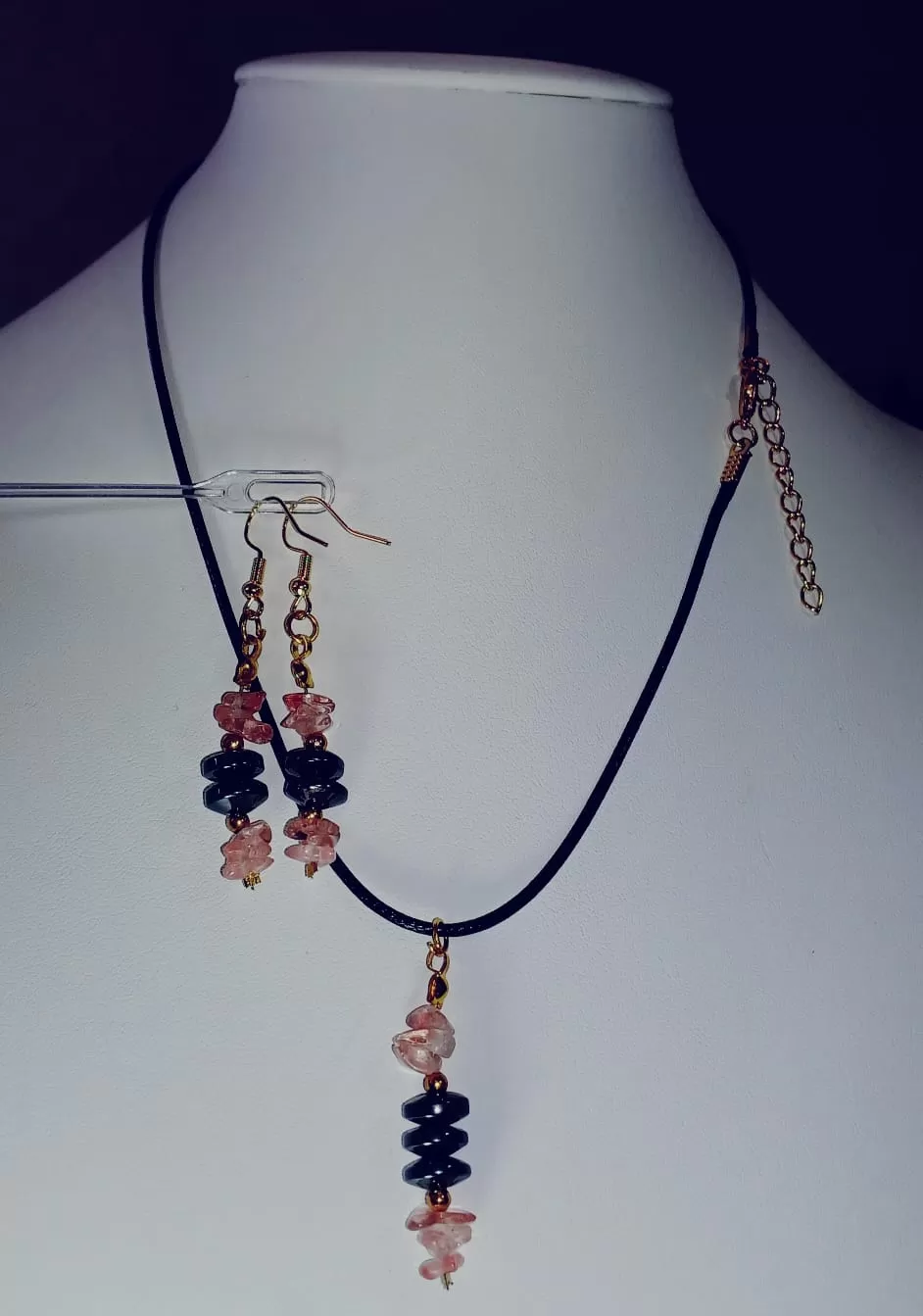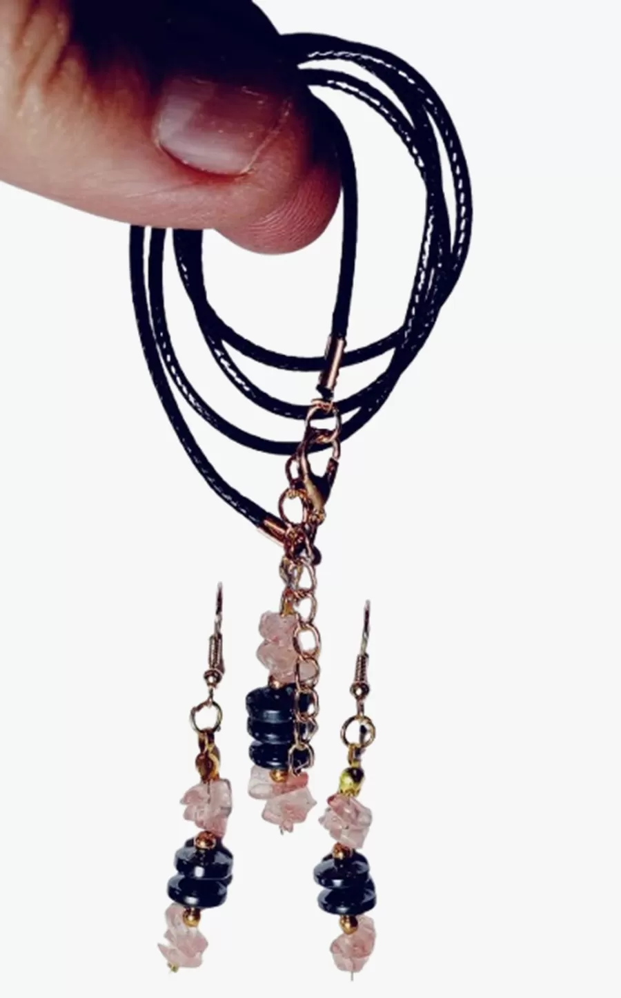 Colar Cordão com Pedras Quartzo Rosa e Hematistas com Pingente e Brinco Grátis.