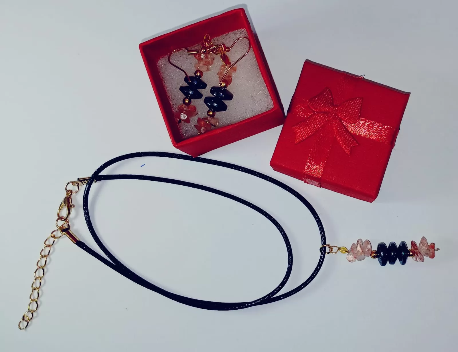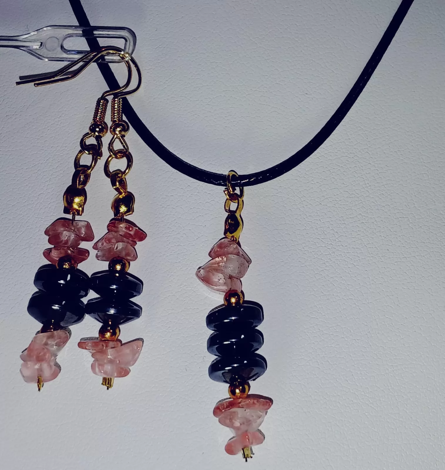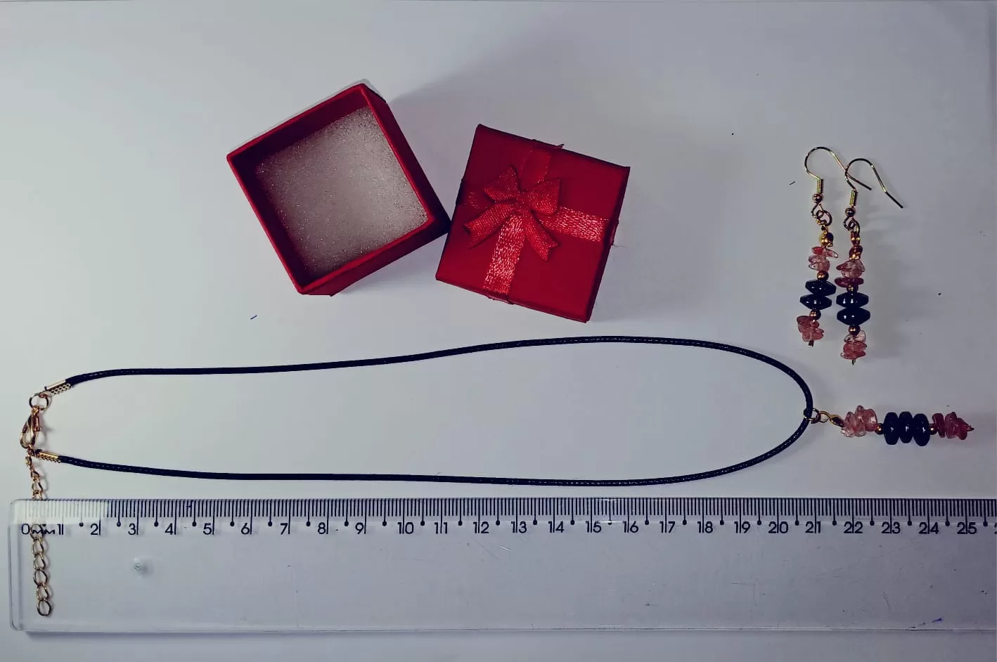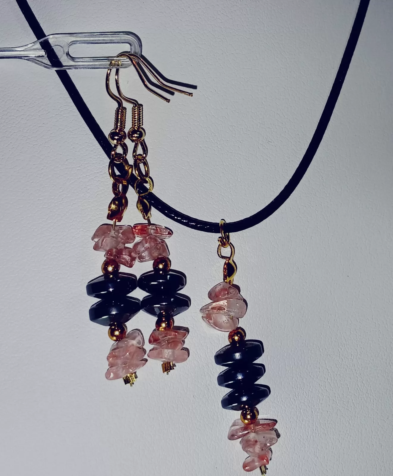 Colar Cordão com Pedras Quartzo Rosa e Hematistas com Pingente e Brinco Grátis.