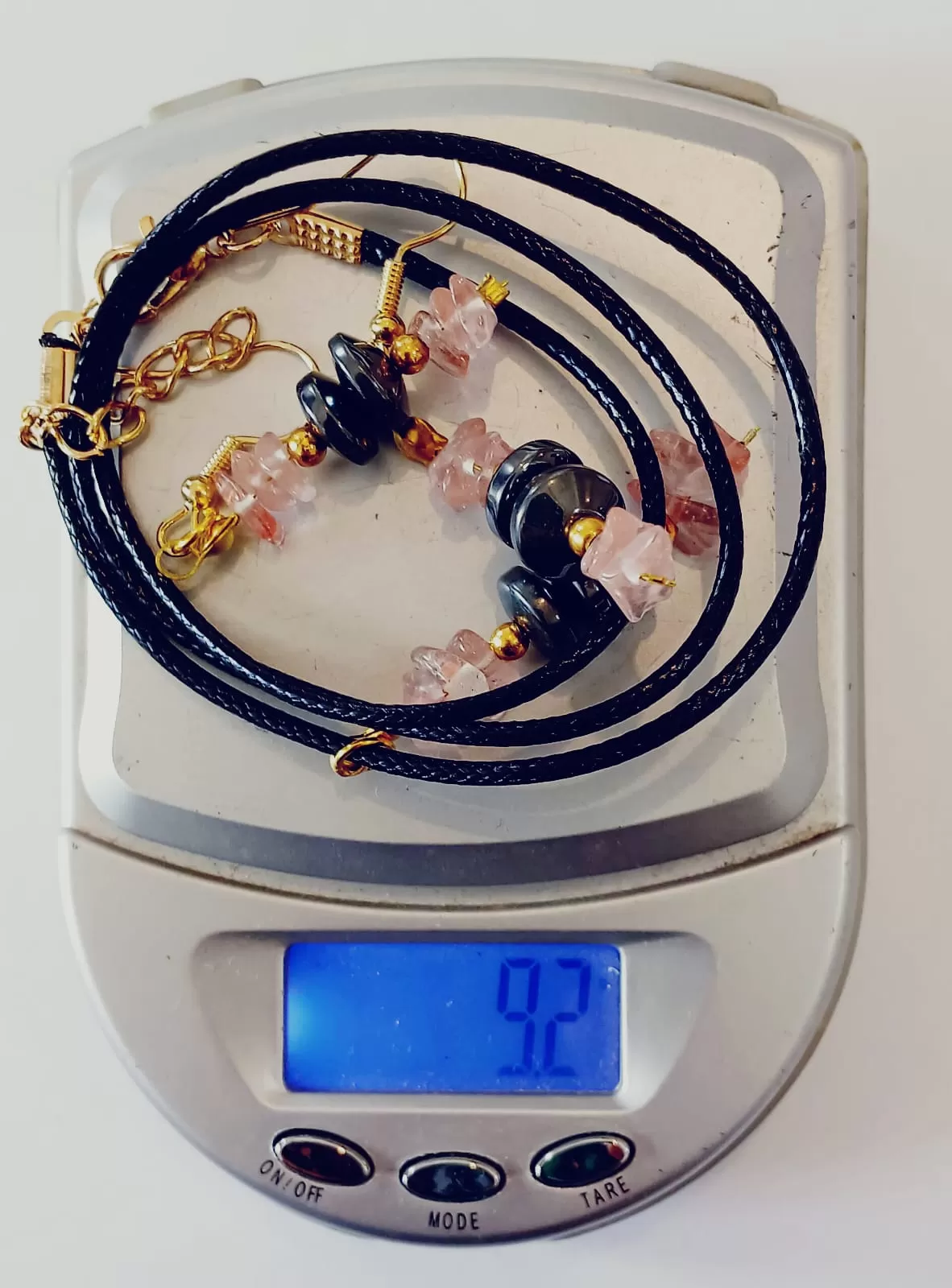 Colar Cordão Pedras Quartzo Rosa e Hematitas + Brinco Cr795