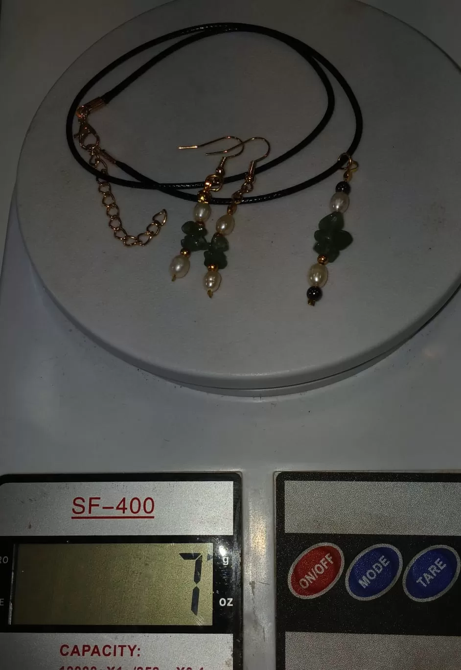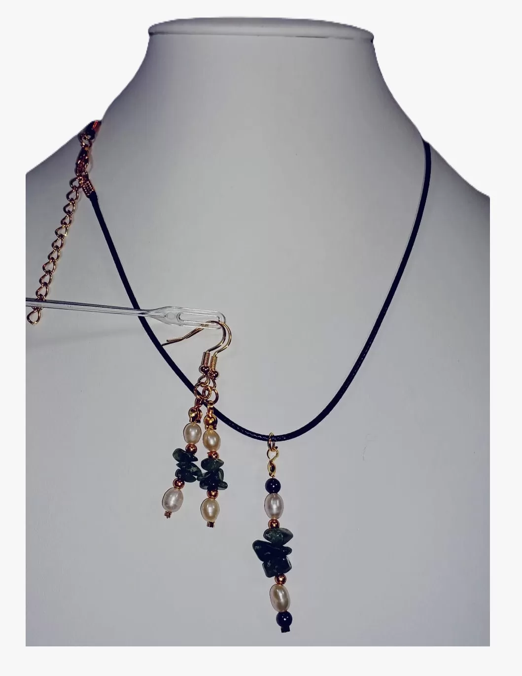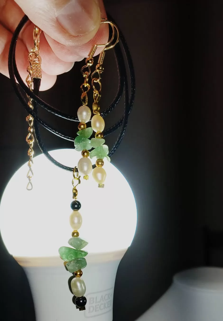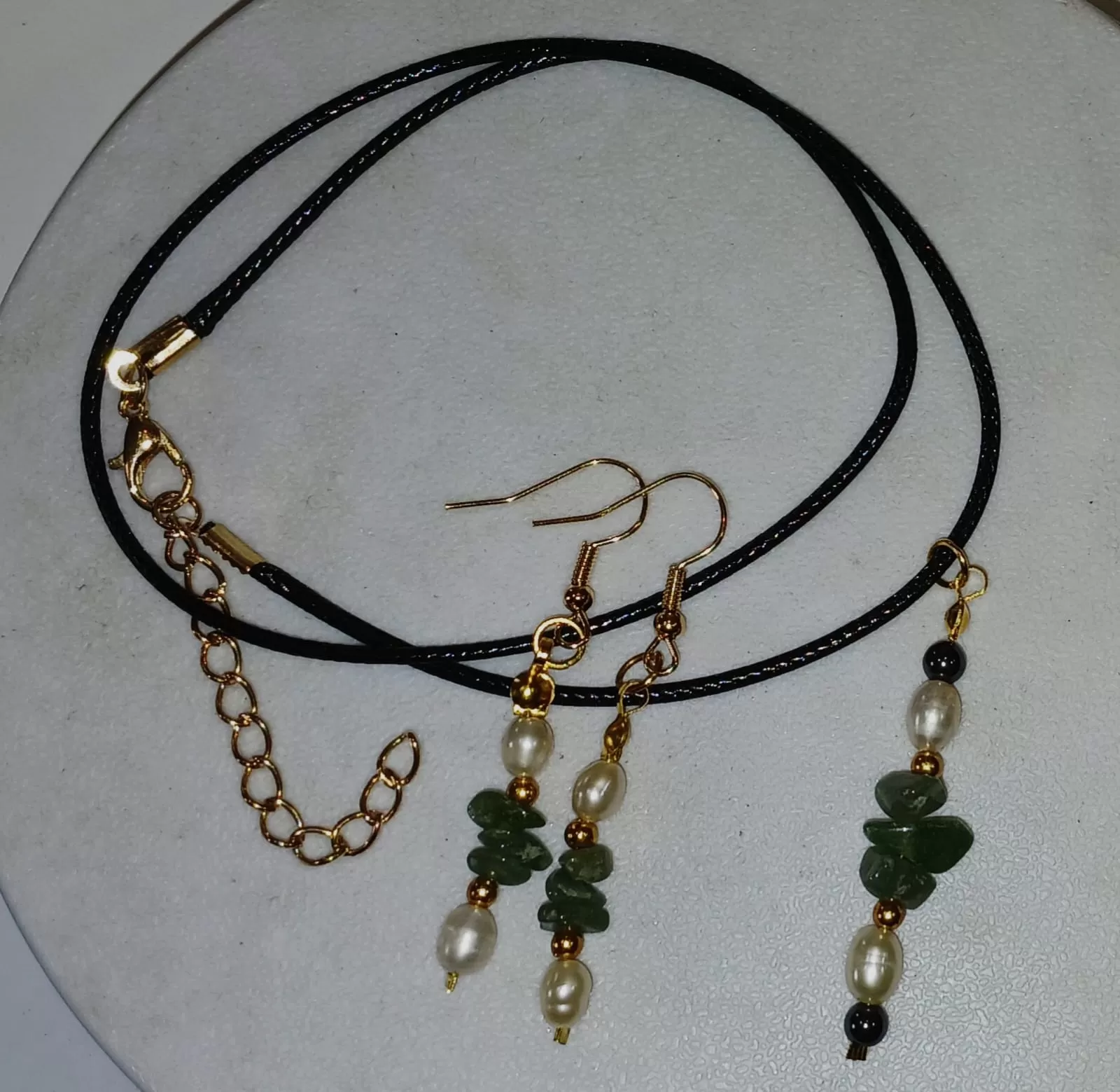 Colar Cordão Quartzo Verde Pérolas e Hematitas+ Brinco Cr785