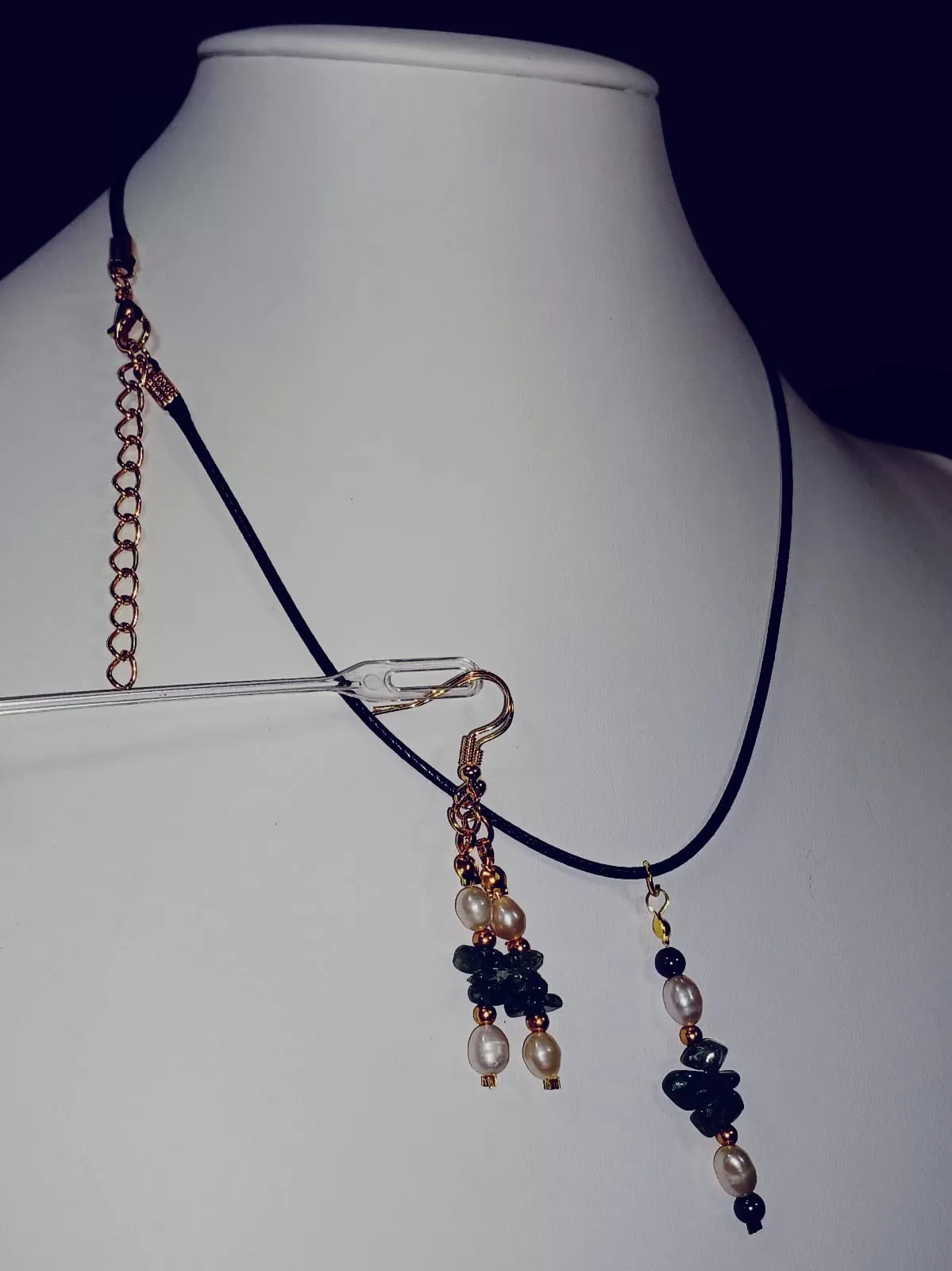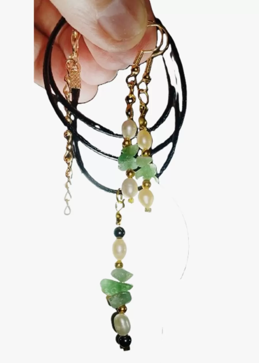 Colar Cordão Quartzo Verde Pérolas Naturais de Água Doce e Hematitas + Brinco Grátis