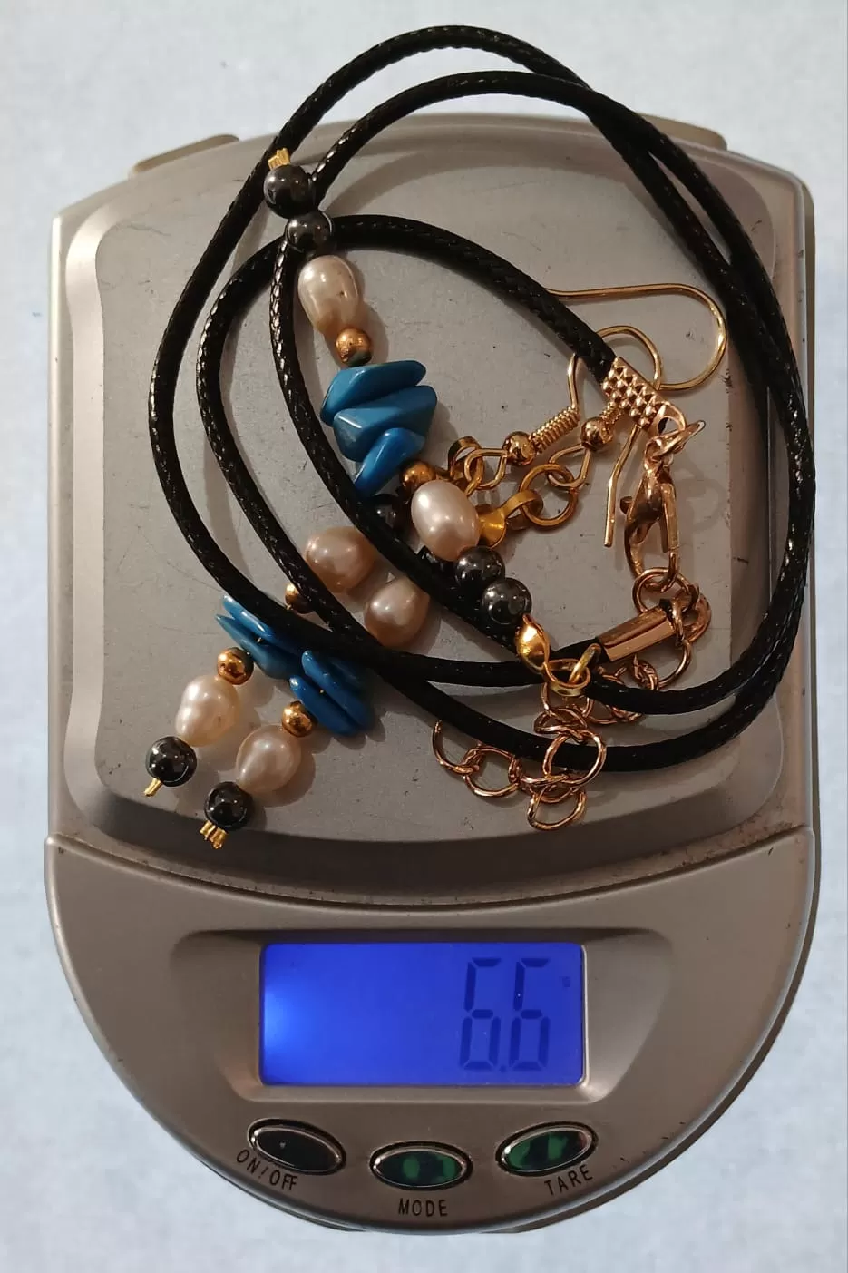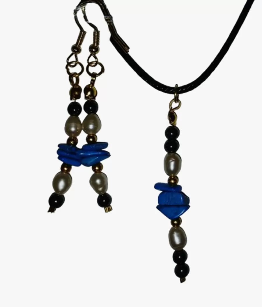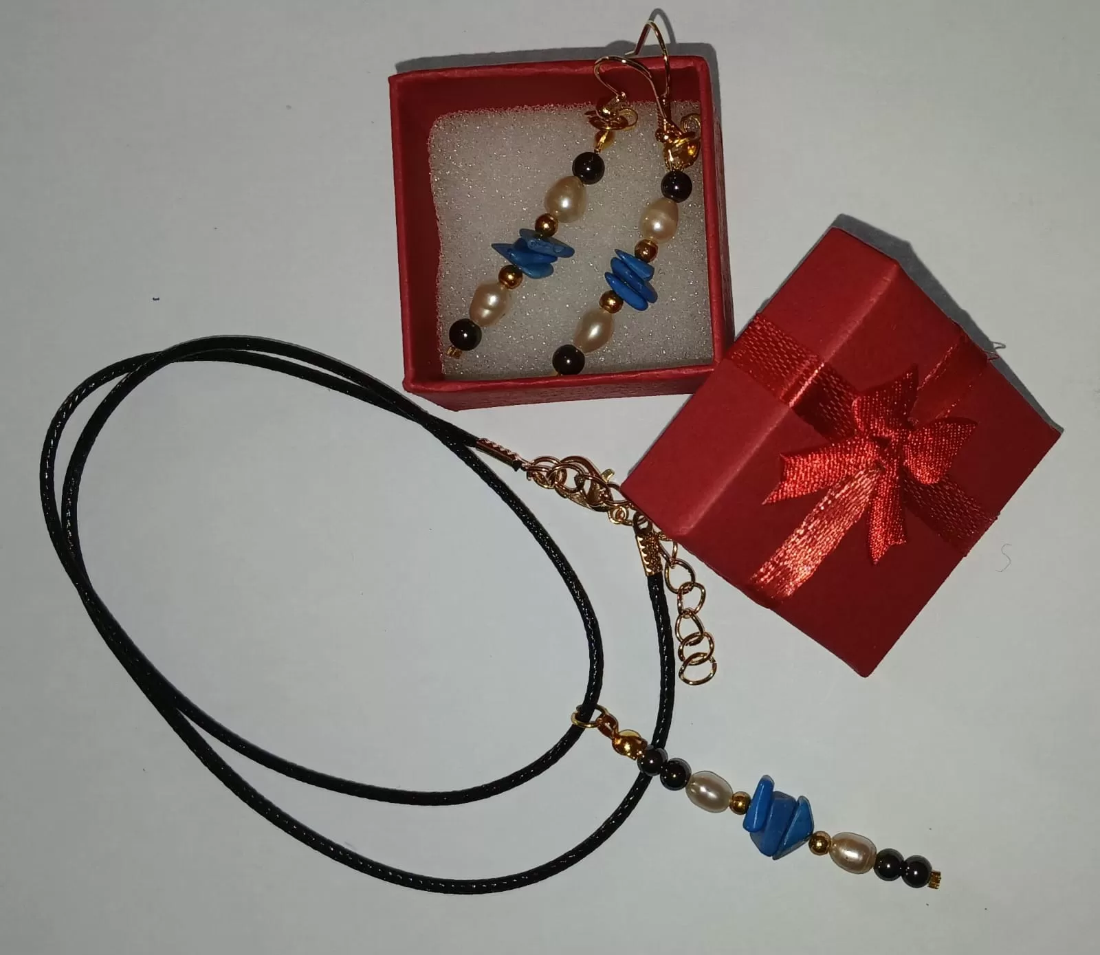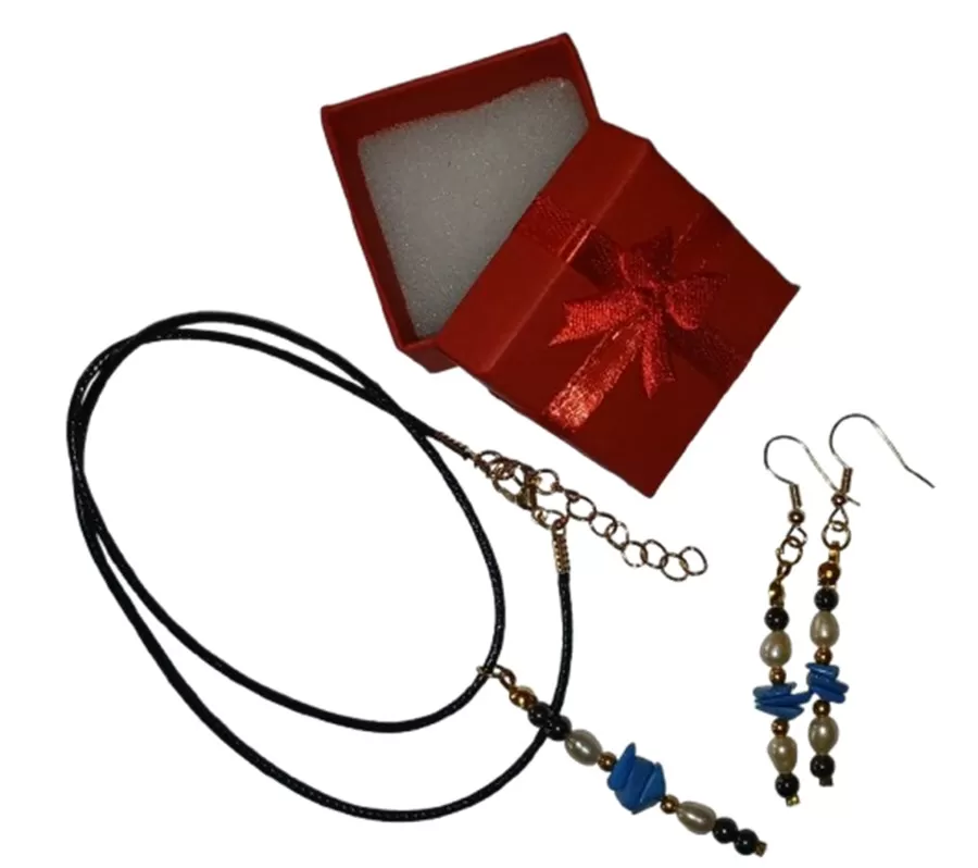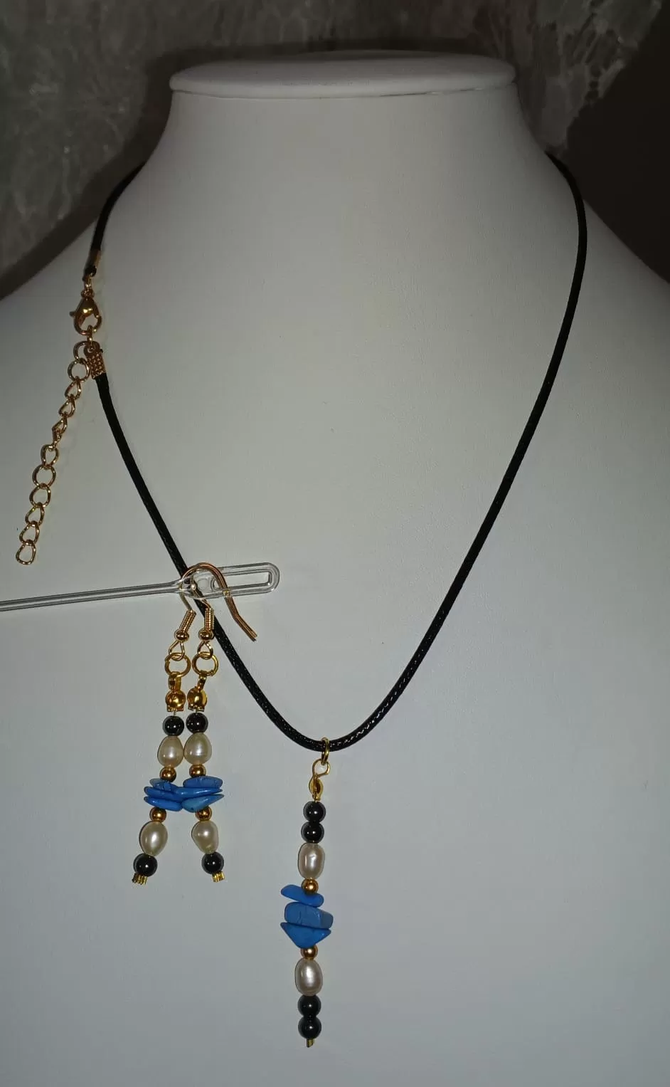 Colar Cordão Tipo Courinho Howlita cor Turquesa, Pérolas de Água Doce e Hematitas + Pingente e Brinco.
